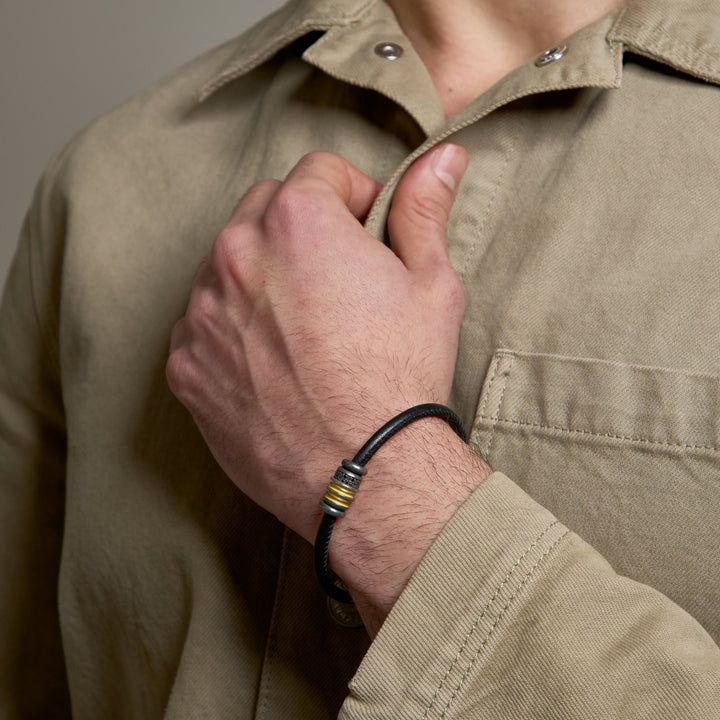 ACIES SLIDING GEMSTONE B... ACIES SLIDING GEMSTONE BRACELET Oxidized Silver, Yellow Enamel, Black Leather, Black Diamonds