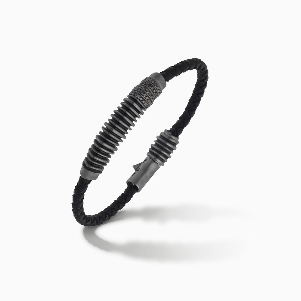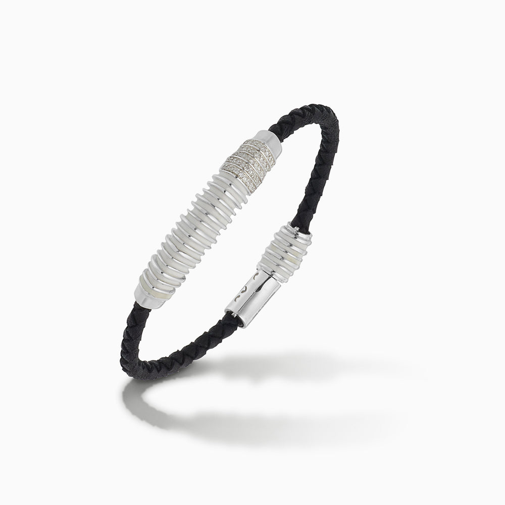 ACIES Caged Gemstone Bracelet Polished Silver, Black Enamel, Black Leather, Black Diamonds