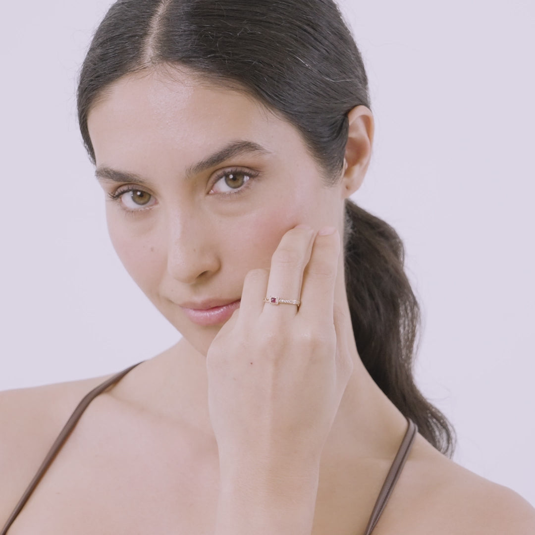 Handcrafted in 18k rose gold, this Orion square ring unites 0.26 carat of diamonds with a 0.28 carat ruby, each set with sculptural precision. The design’s warm tone and geometric balance capture a quiet radiance inspired by celestial alignment.