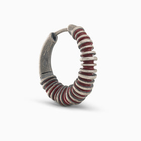 The Acies Satellite Hoop Earrings are a striking expression of contemporary style and artisanal craftsmanship. The oxidized silver hoops provide a textured, sophisticated backdrop, while the vivid red enamel infuses each piece with a bold, passionate flair. These earrings are designed for the man who is confident in making a statement with his accessories, embodying a perfect balance of edge and elegance.