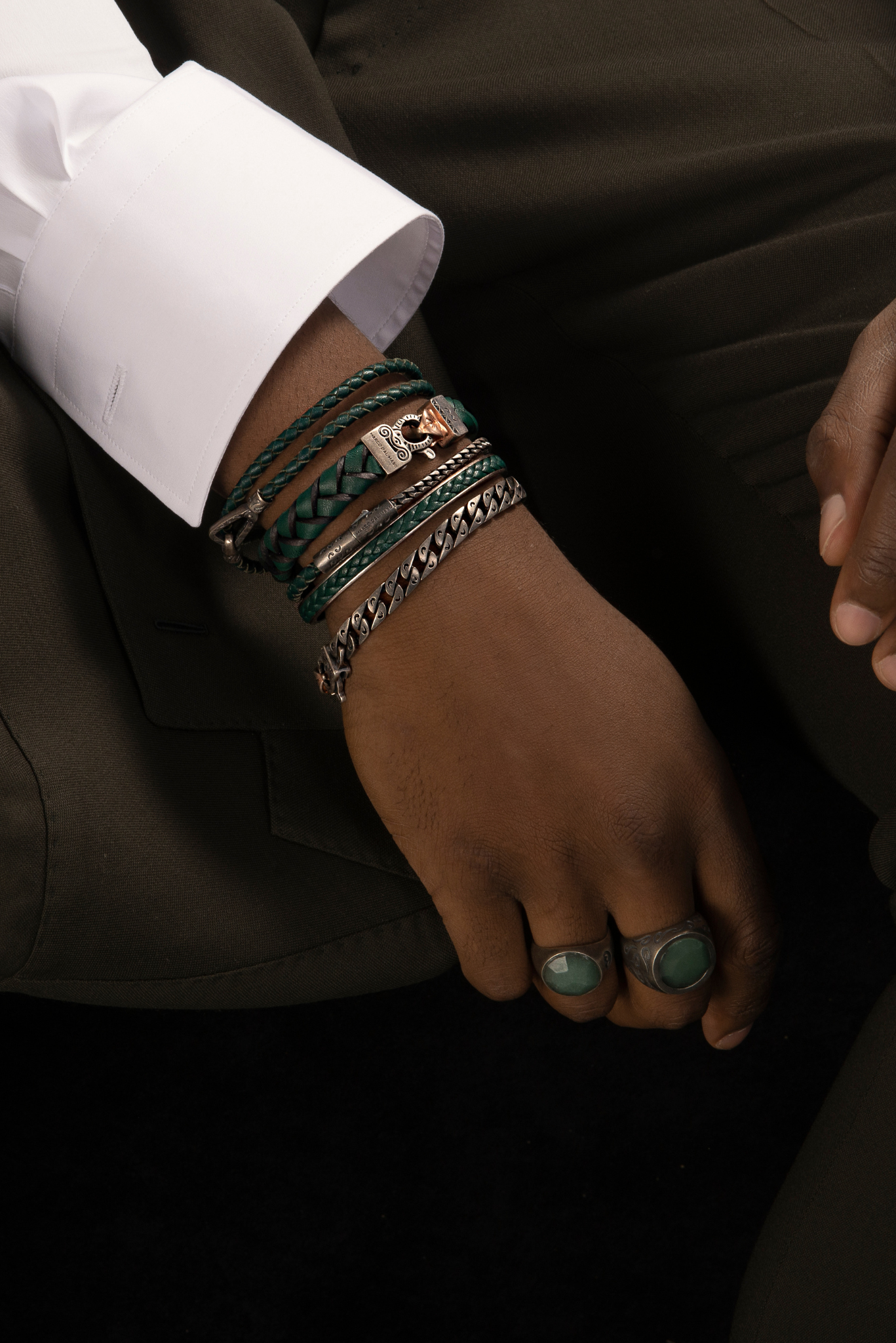 The Lash Wide Braided Green Leather Cuff features vibrant Italian leather and a wider design, offering a bold, sophisticated statement piece. Perfect for men looking for a unique accessory that stands out while maintaining a refined style.