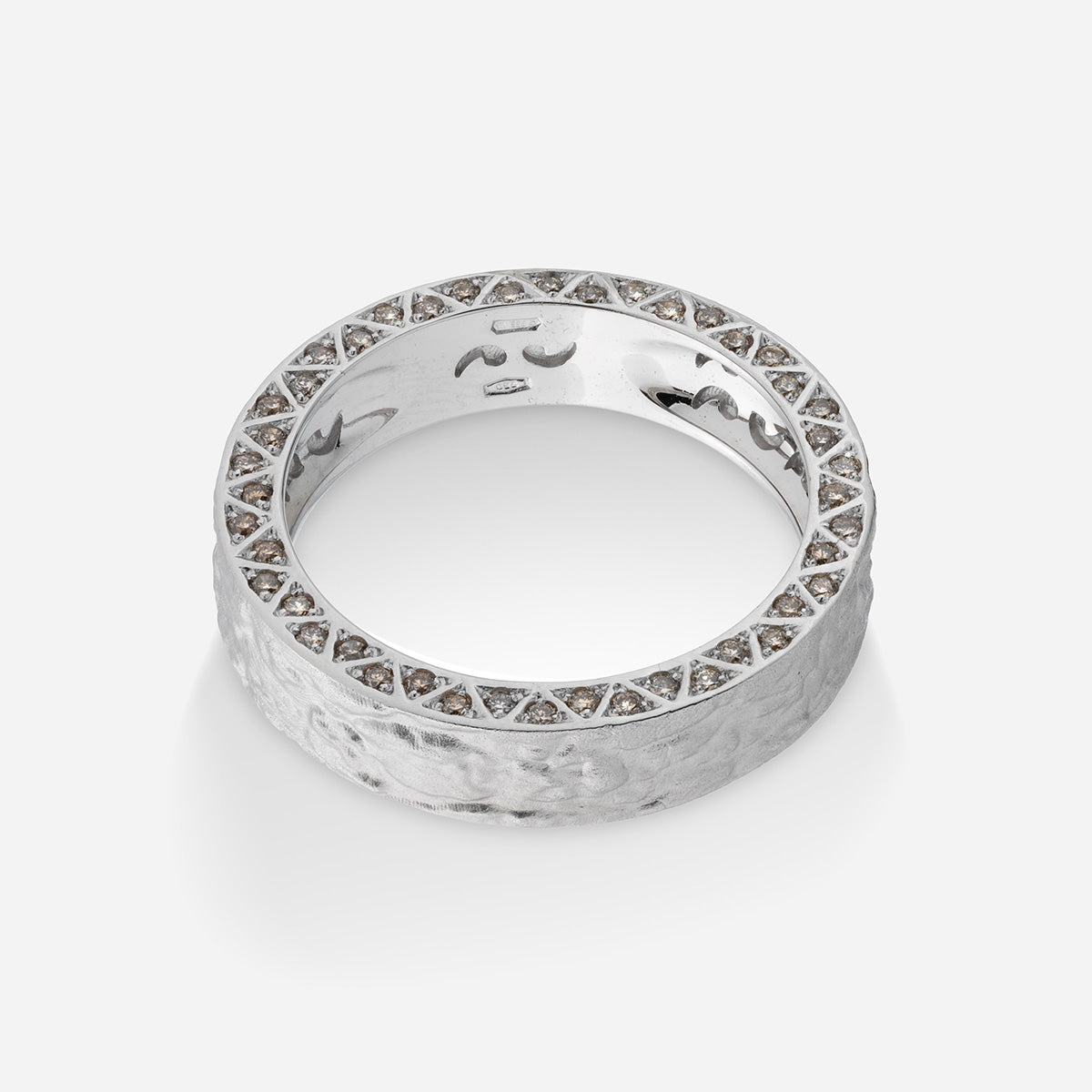 The Manawa Pavé Edge 18K White Gold Ring with Side Champagne Diamonds is a luxurious statement ring. Featuring 0.76 carats of side-set champagne diamonds, this elegant design captures the beauty of timeless craftsmanship with a modern edge.