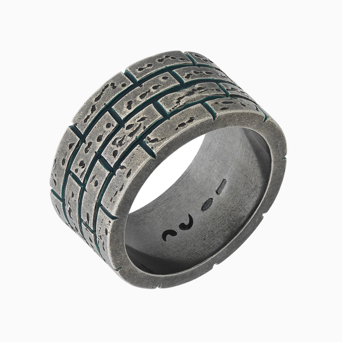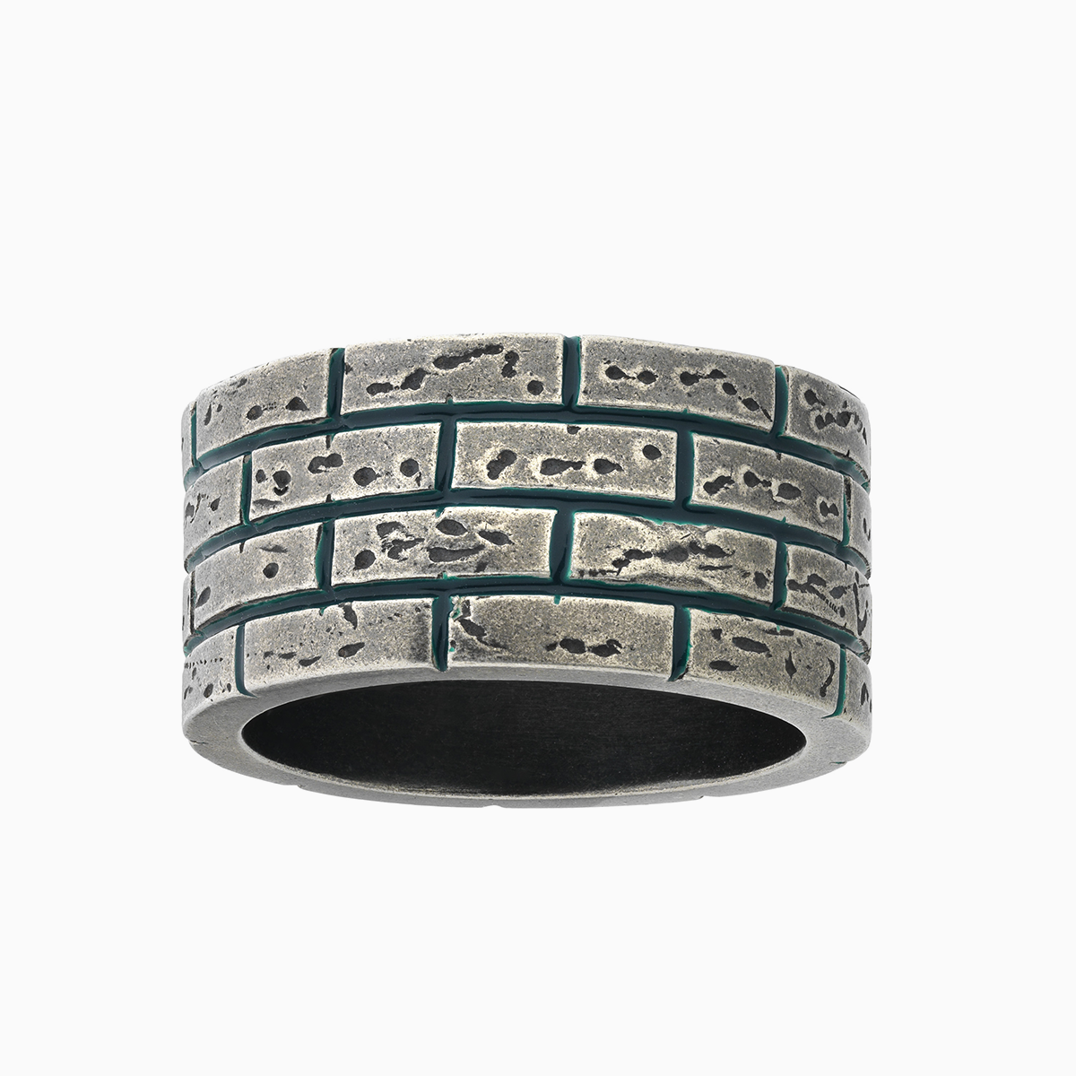 The Murales Oxidized and Green Enamel Wide Ring pairs oxidized silver with striking green enamel, creating a contemporary yet classic accessory.