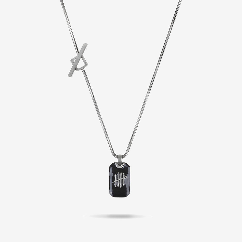 The Triumph Brown Enamel Necklace features a striking brown enamel inlay on an oxidized silver tag, delivering a modern, refined accessory.