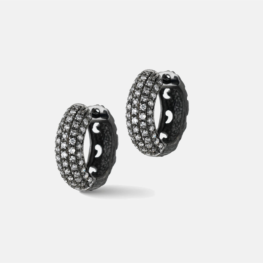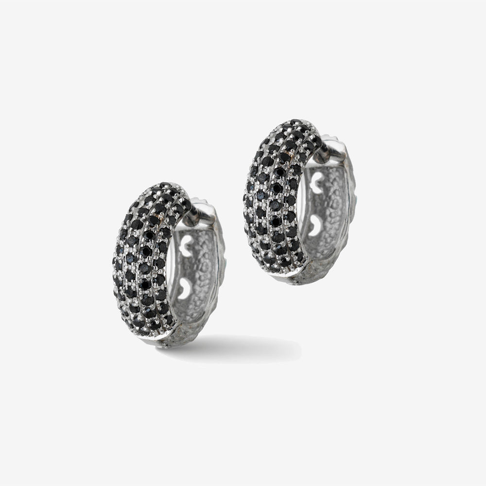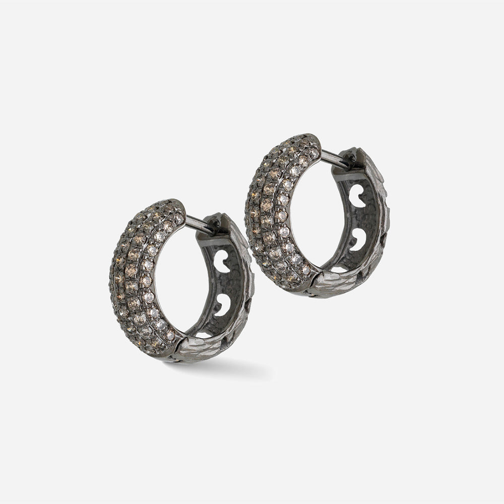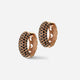 The Warrior Hoop Earrings in 18K rose gold feature pave-set black diamonds, offering a bold and luxurious statement for women seeking standout jewelry.