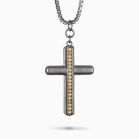 The Acies Cross Pendant is an exquisite emblem of faith, meticulously crafted with a sleek black finish. Adorned with 0.36 carats of blue sapphires, it reflects a celestial beauty, while the blue enamel enhances its profound symbolism. This pendant is a modern tribute to timeless beliefs, offering a touch of divine elegance to the discerning gentleman’s collection.