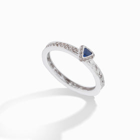 Handcrafted in 18k white gold, this Orion triangular ring unites 0.26 carat of champagne diamonds with a 0.20 carat blue sapphire. Its geometric form captures celestial equilibrium, luminous, poised, and shaped through meticulous Italian artistry.