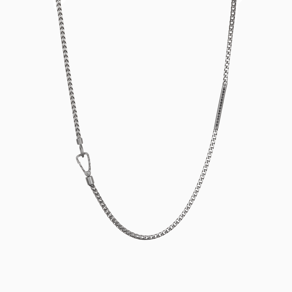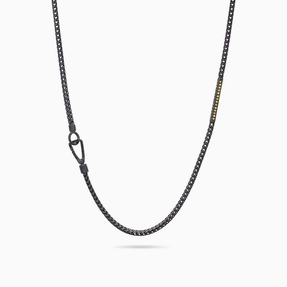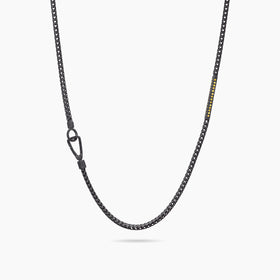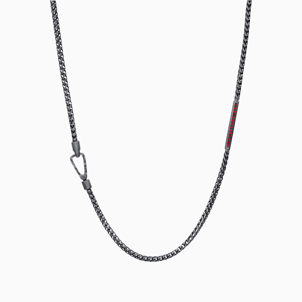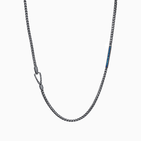 The Ulysses ID Necklace with Blue Sapphires combines the sleek look of a black matte ID chain with the vibrant luxury of 0.77 carats of blue sapphires. This necklace is a perfect choice for those who want to add a pop of color and sophistication to their style.
