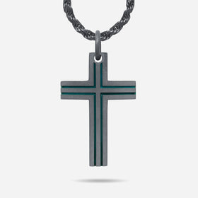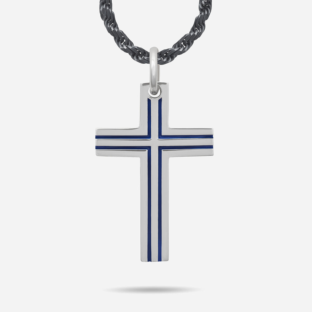 This The Cross Double Enamel Pendant in polished silver is designed with dual blue enamel lines, adding a fresh and sophisticated touch to The Cross motif. Perfect for those who seek a blend of elegance and symbolism.