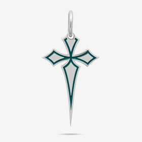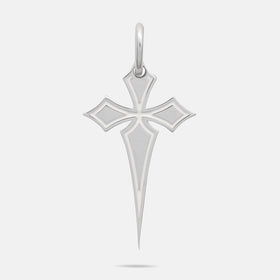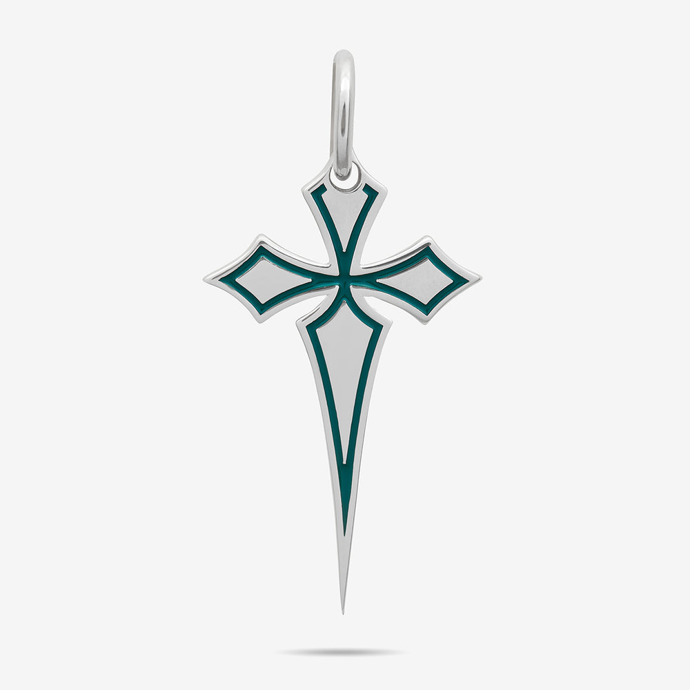 This Gothic amulet in oxidized silver is enhanced by ivory enamel, creating a sophisticated blend of classic and modern style.