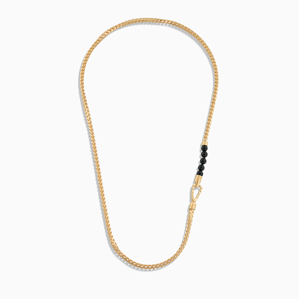 The Ulysses 18K Vermeil Faceted Onyx Beads Chain Necklace combines luxury with a sleek modern aesthetic. The faceted onyx beads create a striking visual contrast with the rich 18K vermeil, offering an accessory that stands out in any setting.