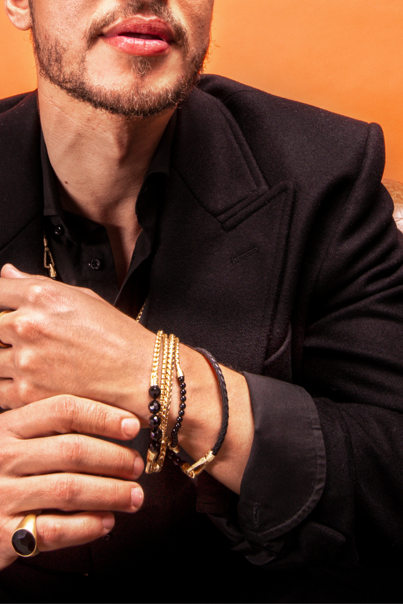 - Faceted onyx beads paired with 18K vermeil for a bold, luxurious look