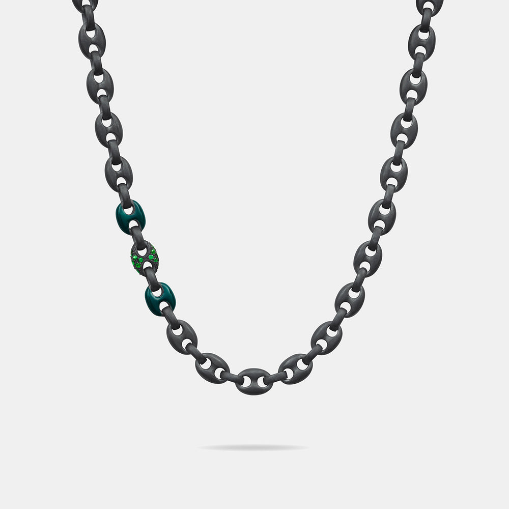 The Ulysses Diamonds Marine Necklace in oxidized silver, adorned with black diamonds and enamel, is a luxurious piece that exudes modern elegance. The combination of dark silver and sparkling diamonds creates a refined, sophisticated accessory that stands out in any setting.