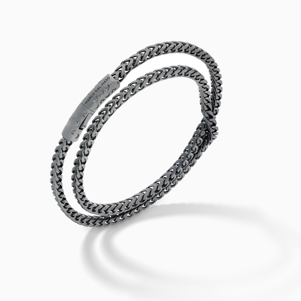 The Ulysses Double Wrap 8mm Chain Bracelet, crafted from oxidized silver, features a sleek double wrap design that adds a touch of modern elegance to any outfit. With its slimmer profile, this bracelet is both versatile and stylish.