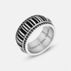 Silver ring with black and white striped design on a white background