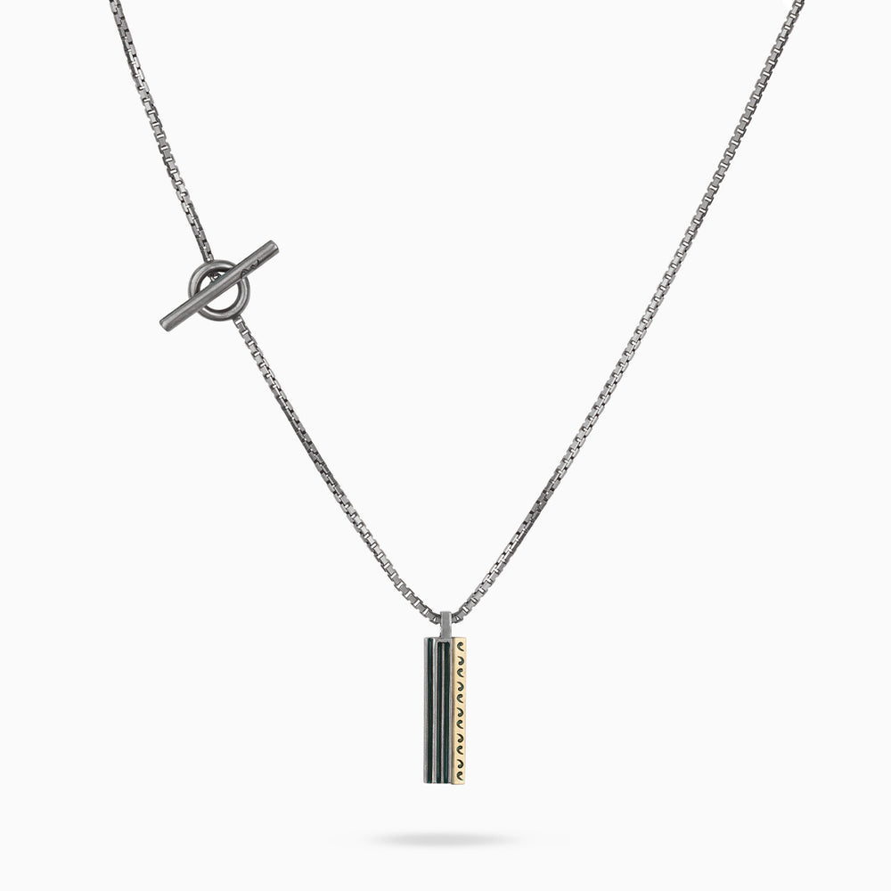 Indulge in the allure of the Acies Mixed Metal Pendant, where the boldness of matte black silver meets the richness of 18K brushed yellow gold. This pendant is a masterpiece of design, featuring a striking green enamel inlay that captures the essence of modern luxury. Perfect for the discerning gentleman, it’s a testament to impeccable taste and a passion for the finer things in life.