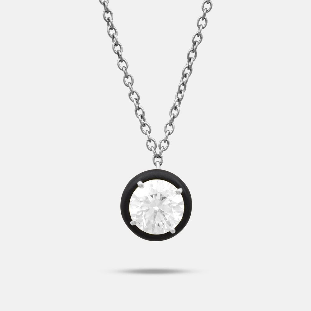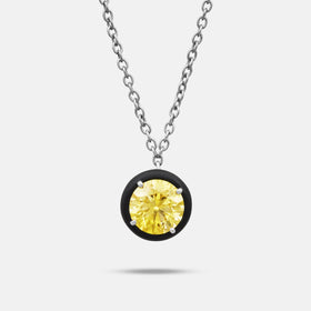 The Eclipse Black Luna Pendant evokes light emerging through an Eclipse. A 1.04ct yellow lab-grown diamond shines from within platinum detailing, anchored in matte black titanium. Clean, architectural, and radiant.