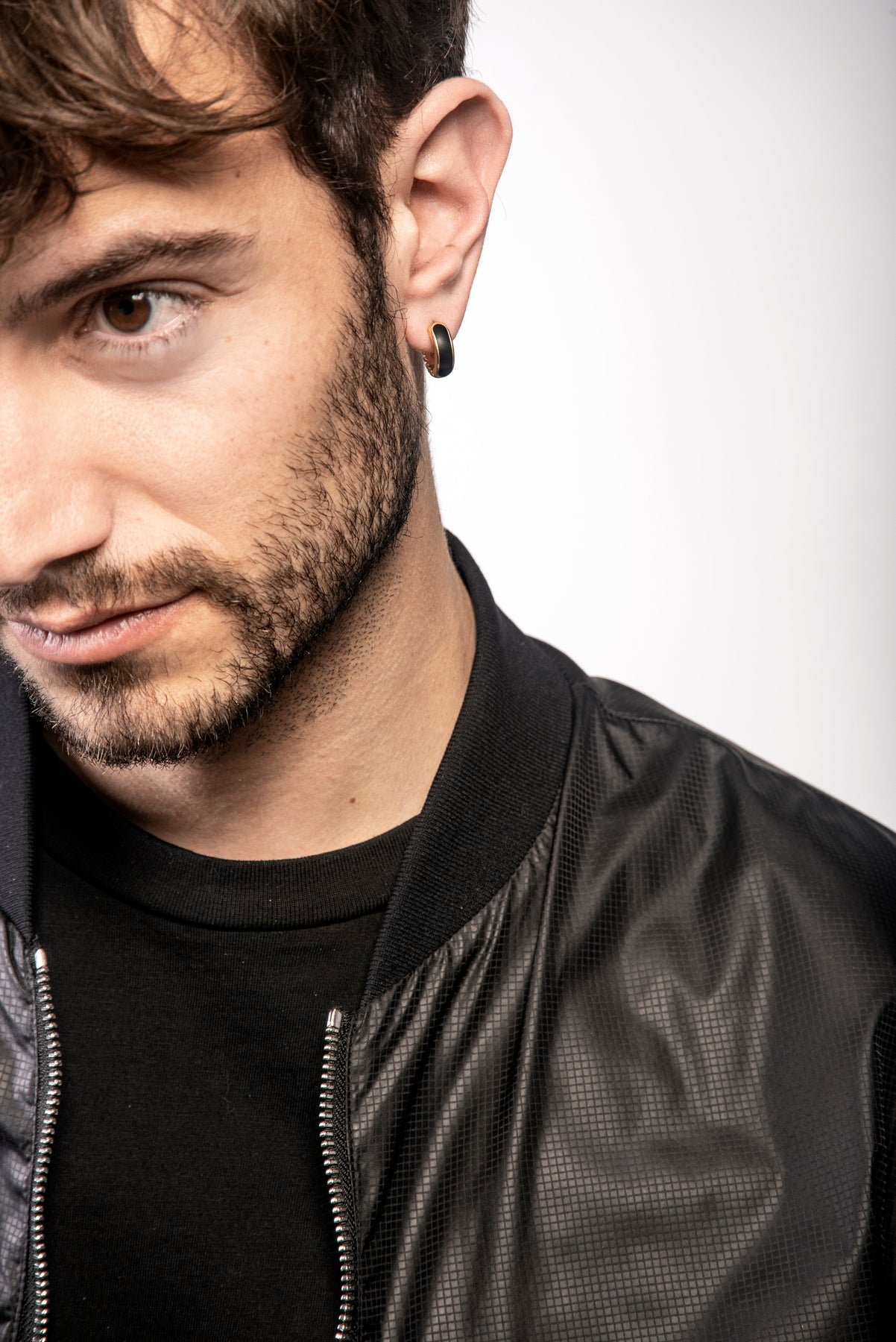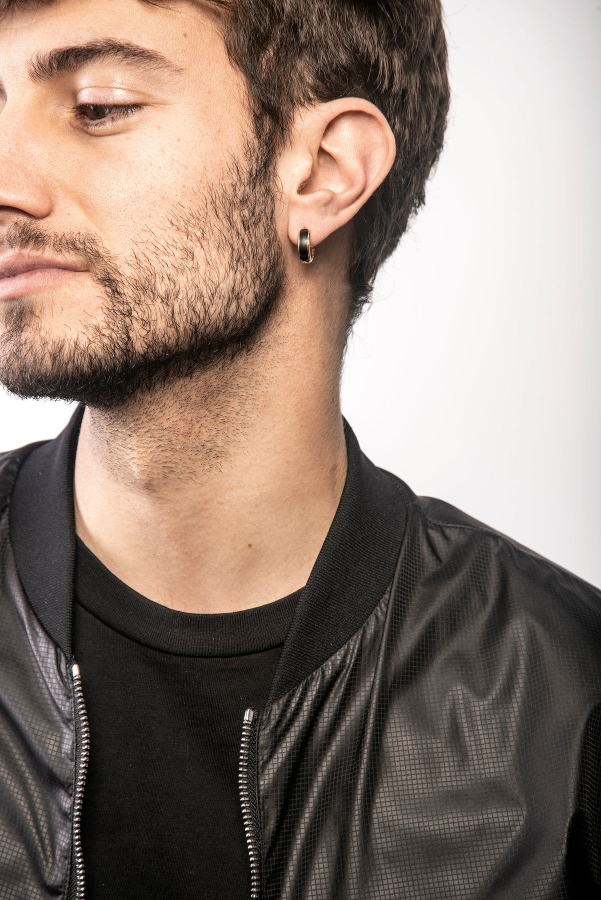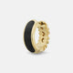 The Frame Enamel Hoop Mono Earring in 18K yellow gold features a minimalist hoop design with black enamel, crafted for an elegant edge.