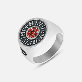 The Moneta Core Pavè Signet Ring is crafted in polished silver and set with red sapphires at its heart, subtle yet unmistakably powerful. This Italian-made ring balances refined proportions with an edge of modern intensity, evoking quiet confidence with every gesture. Designed for those who value unique craftsmanship.