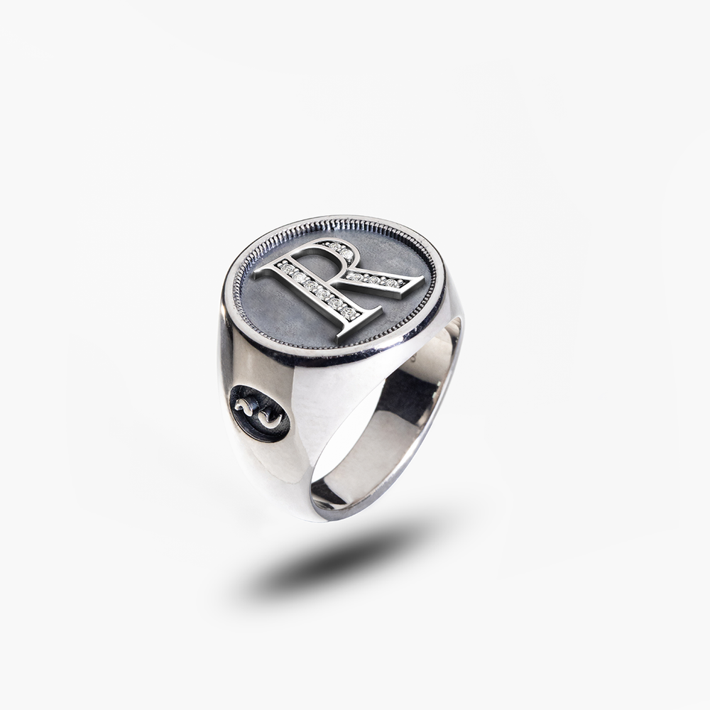 Moneta Vermeil Initial R Ring: This luxurious signet ring is crafted from 18K yellow gold vermeil and adorned with 0.127 ct white diamonds. Perfect for adding a touch of elegance to any outfit.