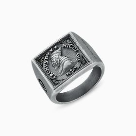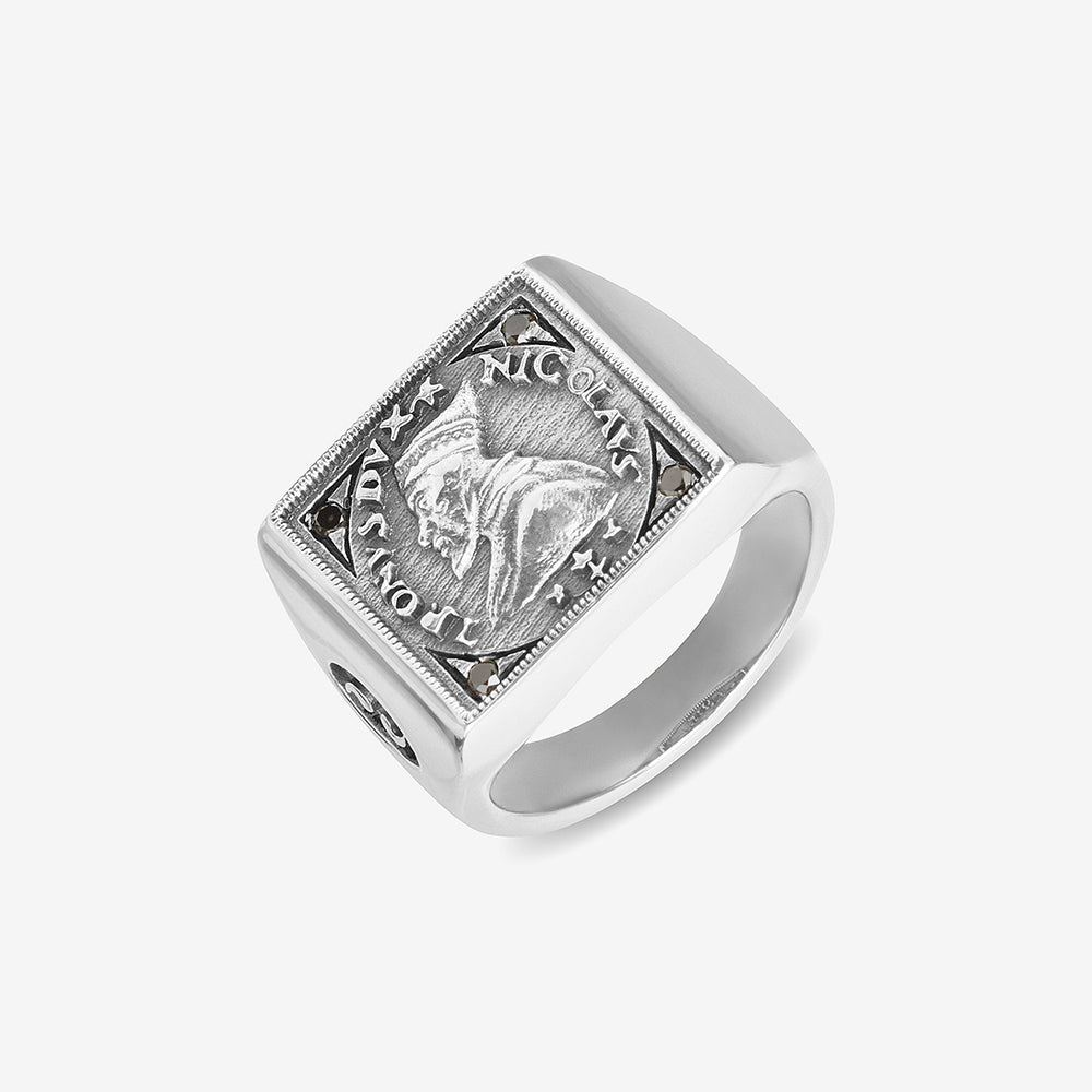 Moneta Nicholaus Ring: This distinctive ring is crafted from polished silver and adorned with 0.08 ct black diamonds, offering a bold and elegant look. Perfect for adding a touch of modern style to any outfit.