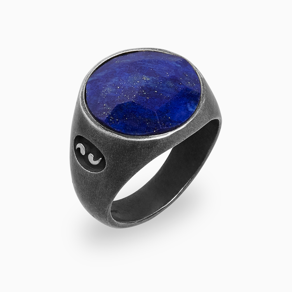 Moneta Oxidized Silver and Lapis Signet Ring: a luxurious piece inspired by historic coinage. This Signet ring is crafted from oxidized silver and features lapis lazuli accents, ideal for a refined and elegant look.