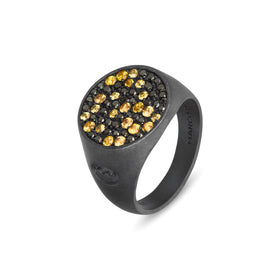 Moneta Yellow Sapphires and Black Diamonds Signet Ring: a blend of elegance and luxury inspired by historic coinage. This Signet ring features oxidized silver and mixed-size yellow sapphires and black diamonds for a refined and timeless look.