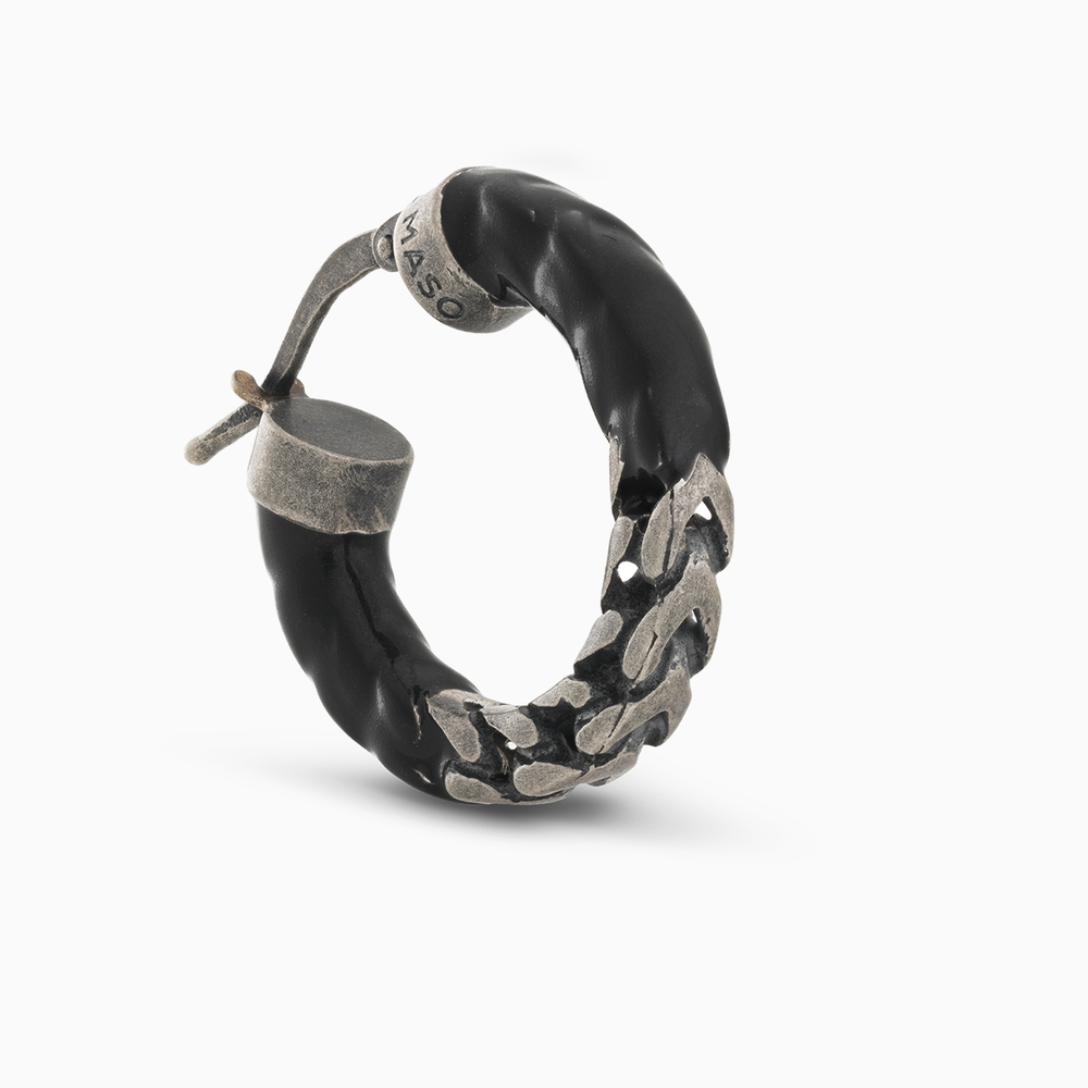 Sleek and stylish, the Ulysses Dipped Oxidized Silver Earring with black enamel is a must-have for any modern wardrobe. The dark tones of oxidized silver are complemented by the deep black enamel for a minimalist yet striking look.