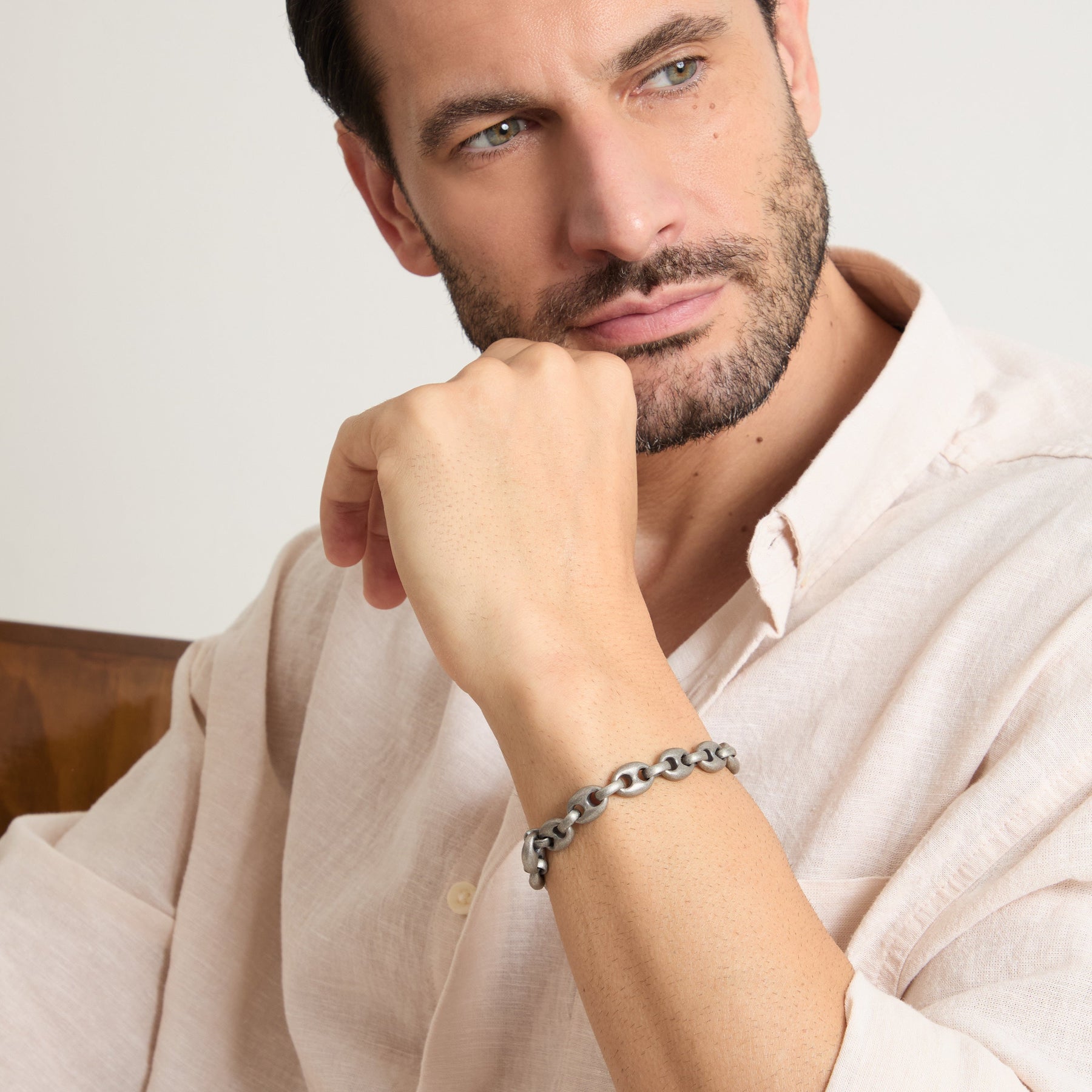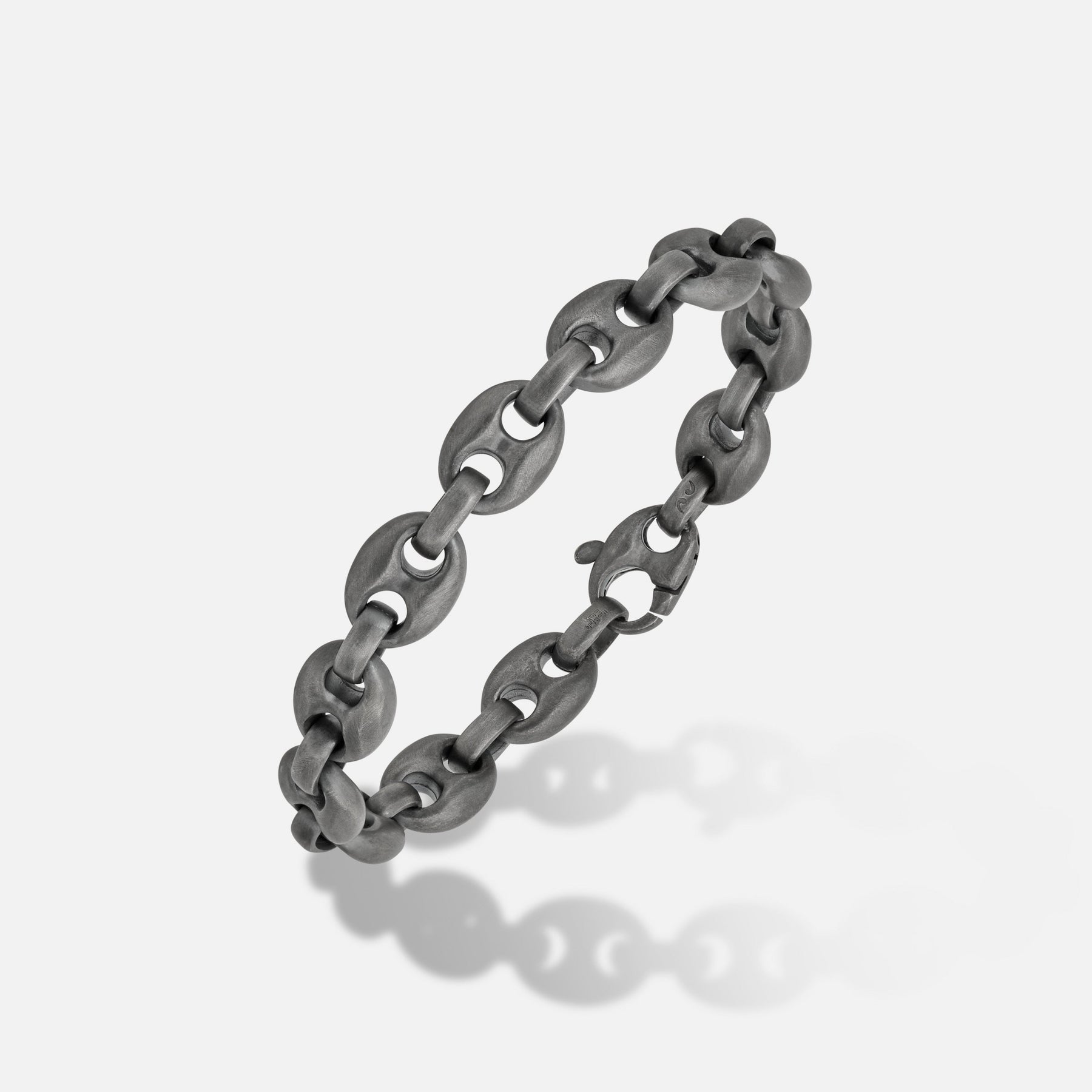 The Ulysses Marine Chain Bracelet combines the dark allure of oxidized silver with the sleek style. This bracelet is a striking accessory that adds a touch of modern luxury to any ensemble, perfect for those who appreciate refined yet bold designs.