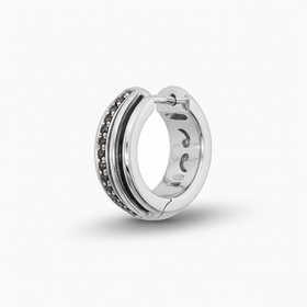 Acies Gemstone Huggie in Polished Silver with Black Enamel and Black Diamonds: a precise balance of texture and brilliance. The polished silver surface is accented with smooth black enamel and pavé-set black diamonds, creating a contemporary expression of subtle power and craftsmanship.