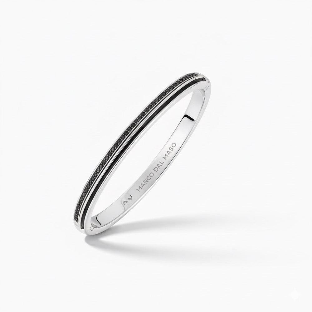 Abbraccia il fascino dell'oscurità con l'Acies Slim Triple Black Matte Silver Cuff, dove il lusso incontra un'estetica audace. Questo sofisticato pezzo è meticolosamente realizzato in argento sterling con una finitura nera opaca, che conferisce un look moderno e maschile. Il polsino è decorato con una sorprendente serie di diamanti neri, per un totale di 0,90 carati, che brillano sottilmente contro la luce. Un elegante intarsio in smalto nero completa il design, offrendo una perfetta combinazione di opulenza e avanguardia.