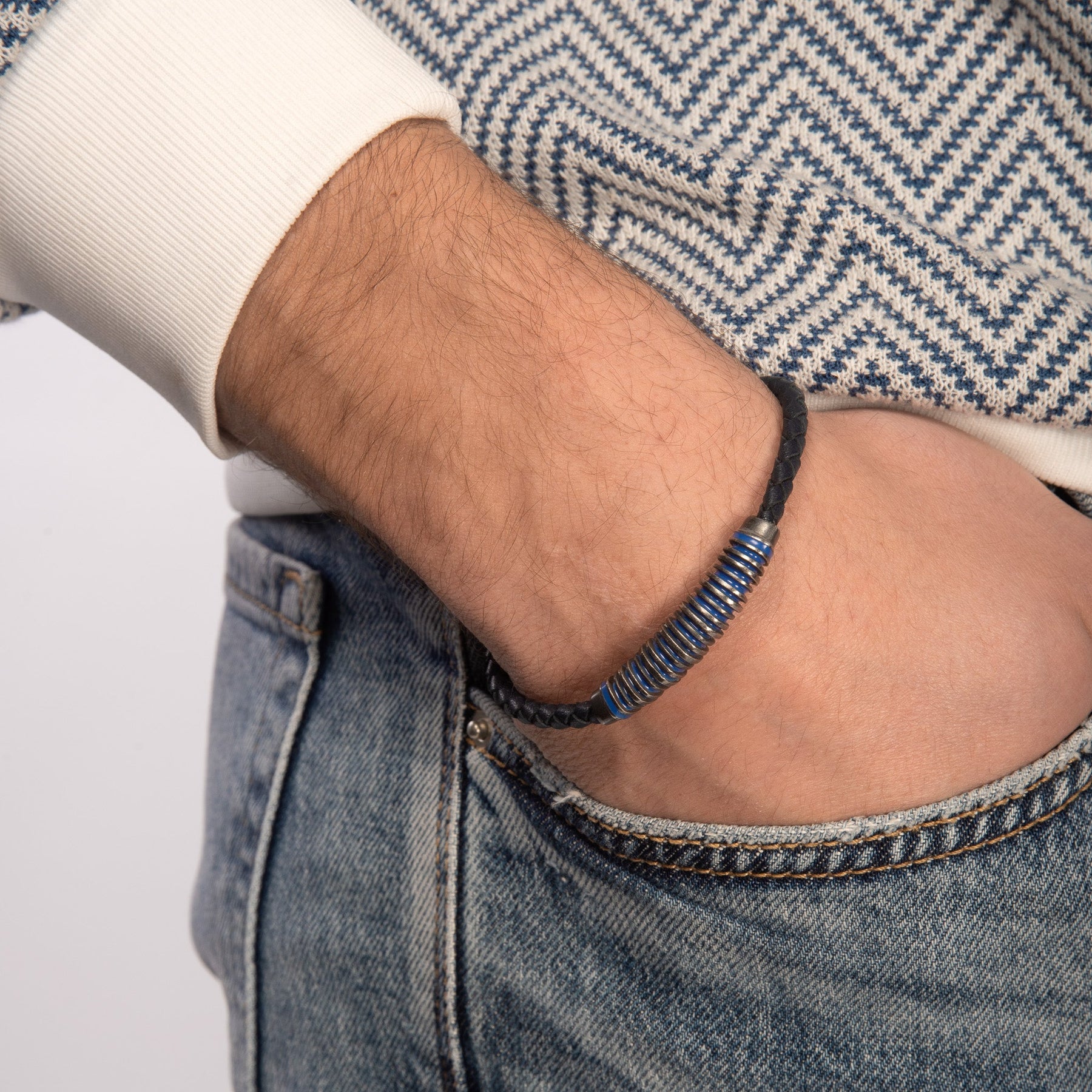 Esalta il tuo stile con il bracciale Acies in argento ossidato e pelle blu con smalto blu. Realizzato con raffinatezza, questo bracciale unisce argento ossidato e pelle blu, impreziosito da uno straordinario smalto blu.