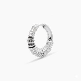 Acies Hoop Gemstone Earring in Polished Silver with Black Enamel and Black Diamonds: a confident balance of light and depth. The polished silver surface is traced with sleek black enamel and pavé-set black diamonds, creating a contemporary design that reflects strength, precision, and understated luxury.