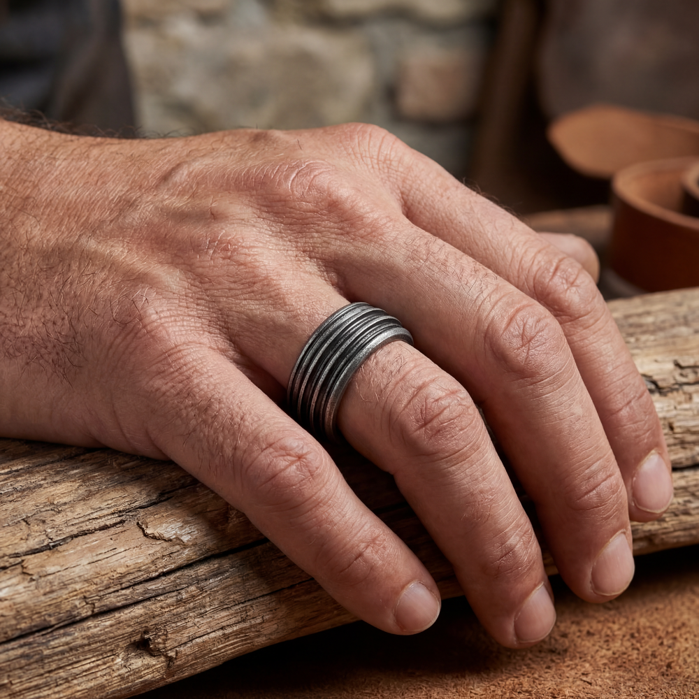 Acies Oxidized Silver Band with Black Enamel: a sleek and timeless accessory. Crafted from oxidized silver, this band features bold black enamel detailing, adding sophistication to any ensemble.