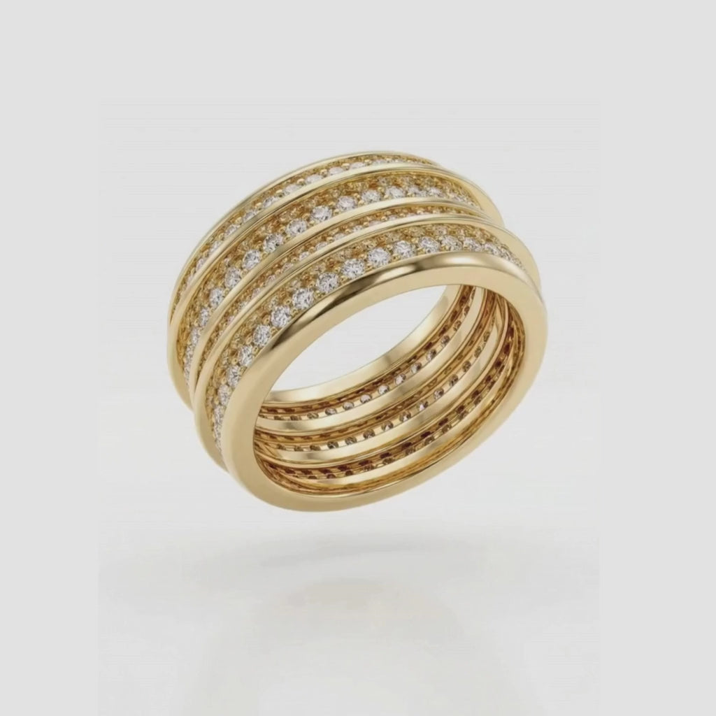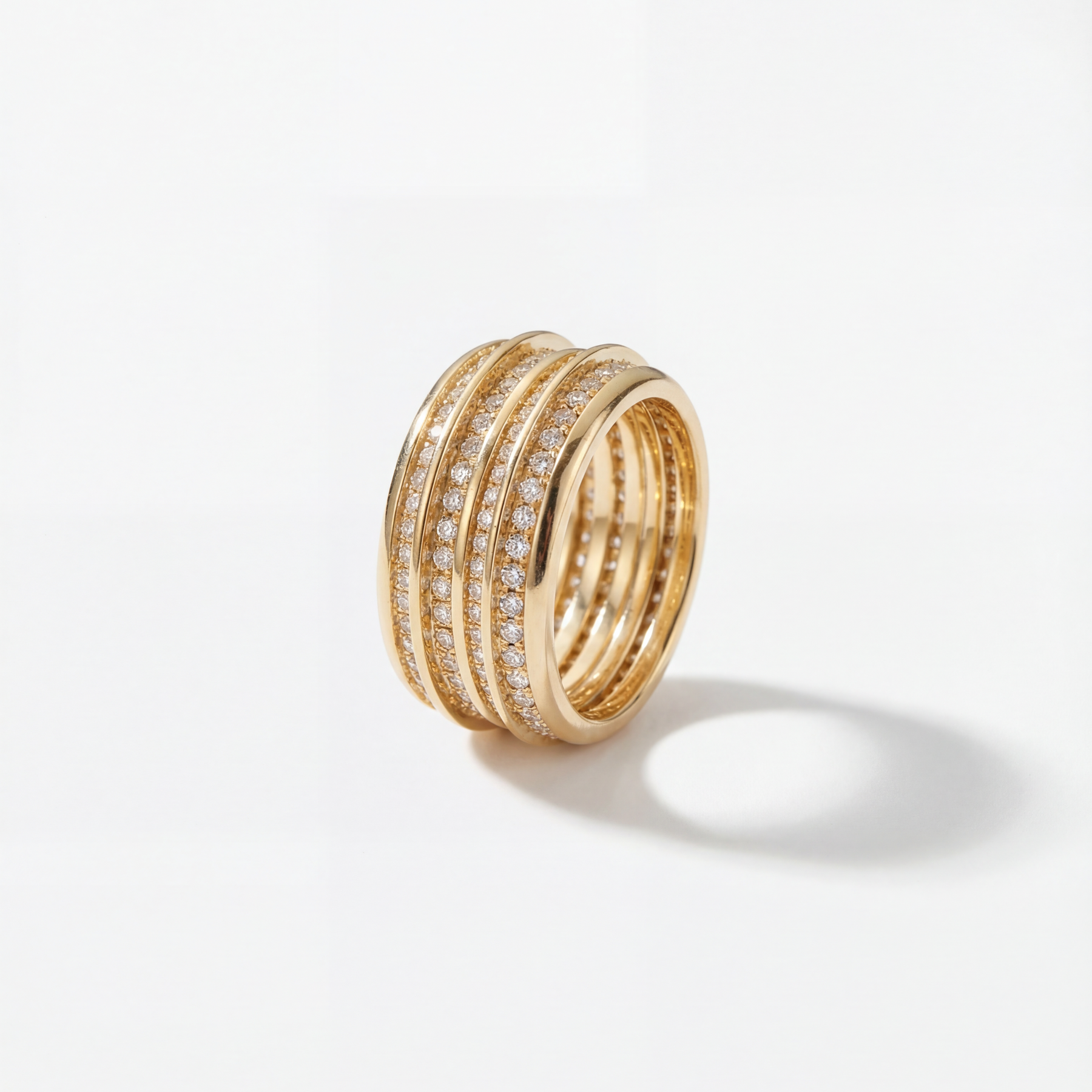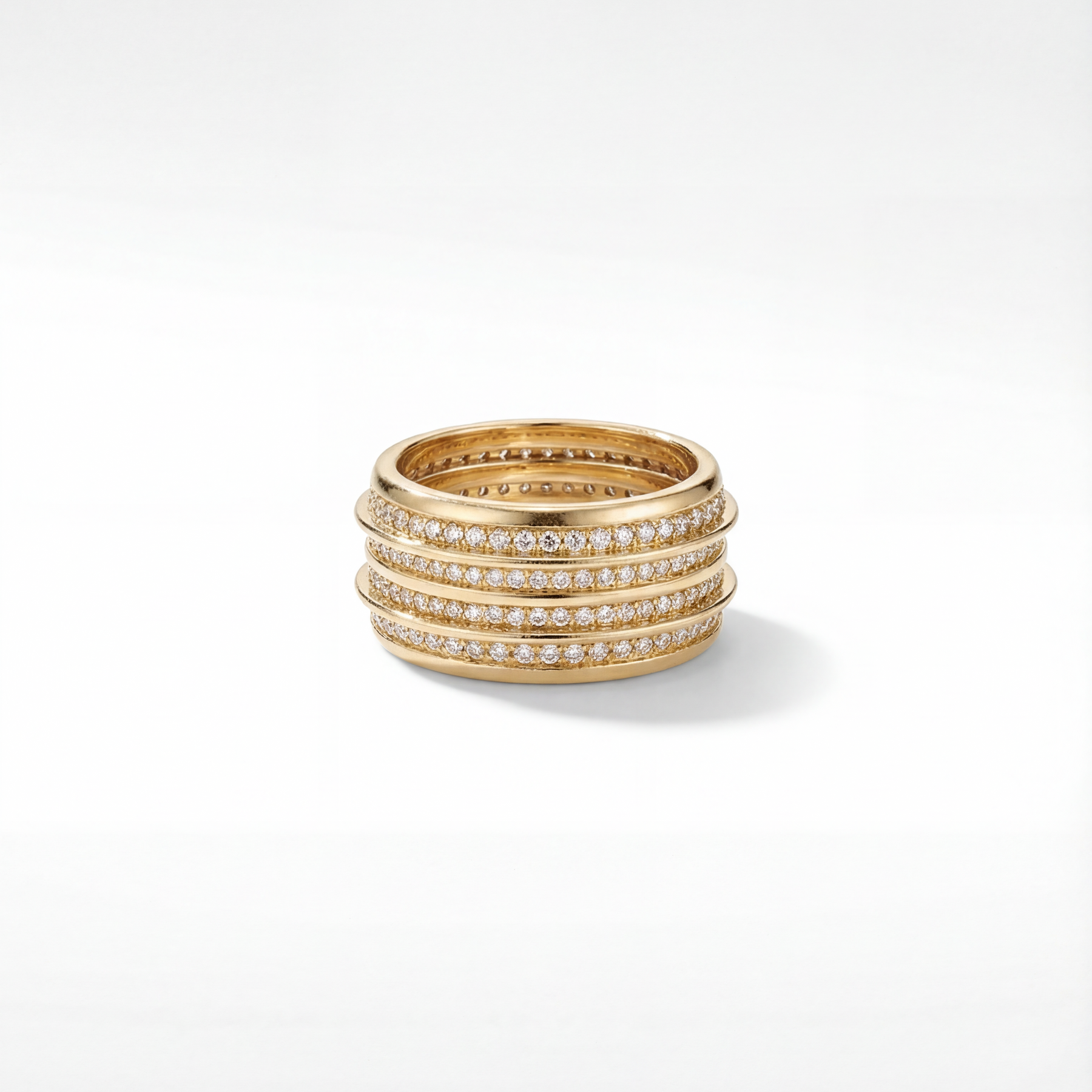 An evolution of the Acies aesthetic, this yellow gold ring is set with white diamonds, an elegant study in restraint. Its clean, continuous form reflects modern craftsmanship and enduring strength.