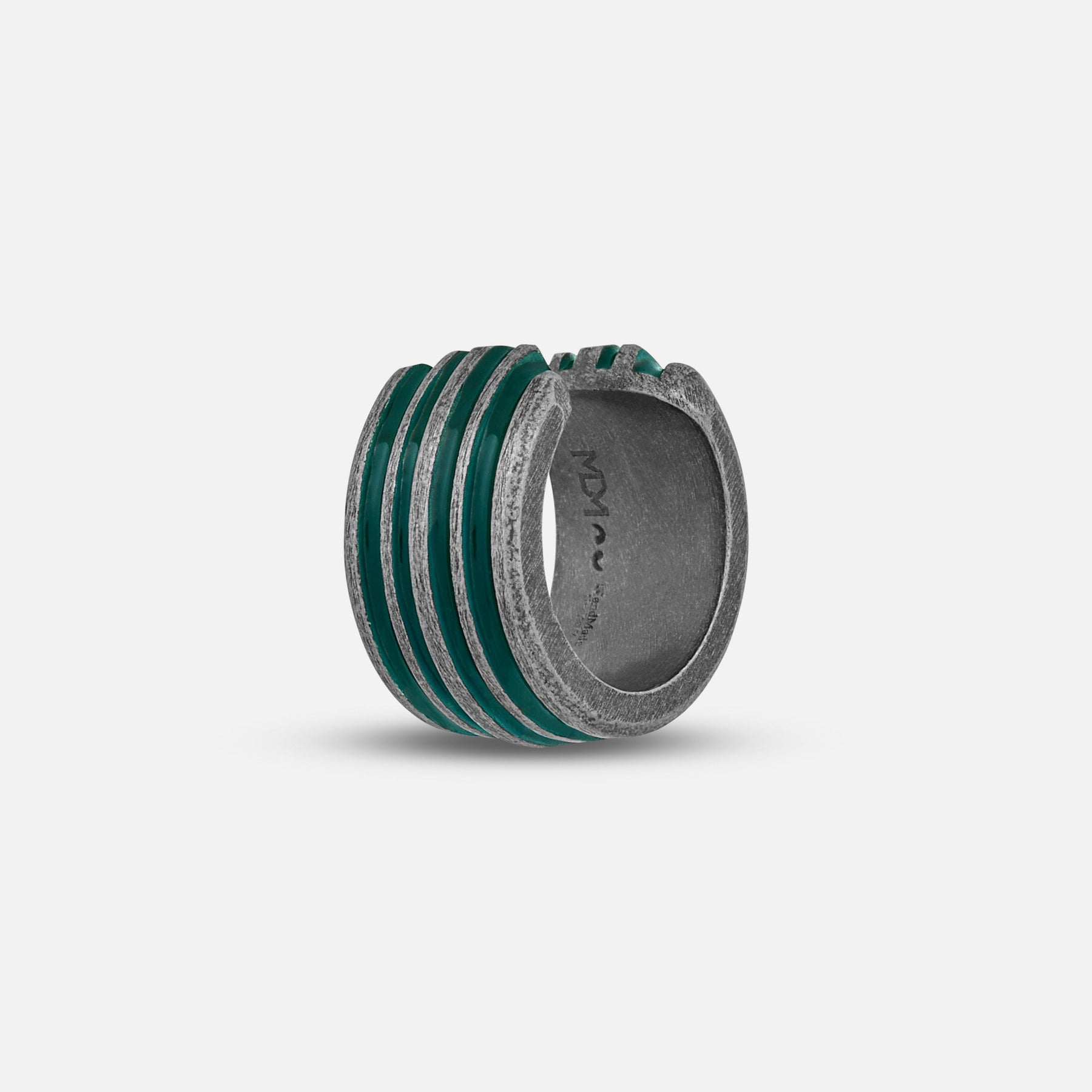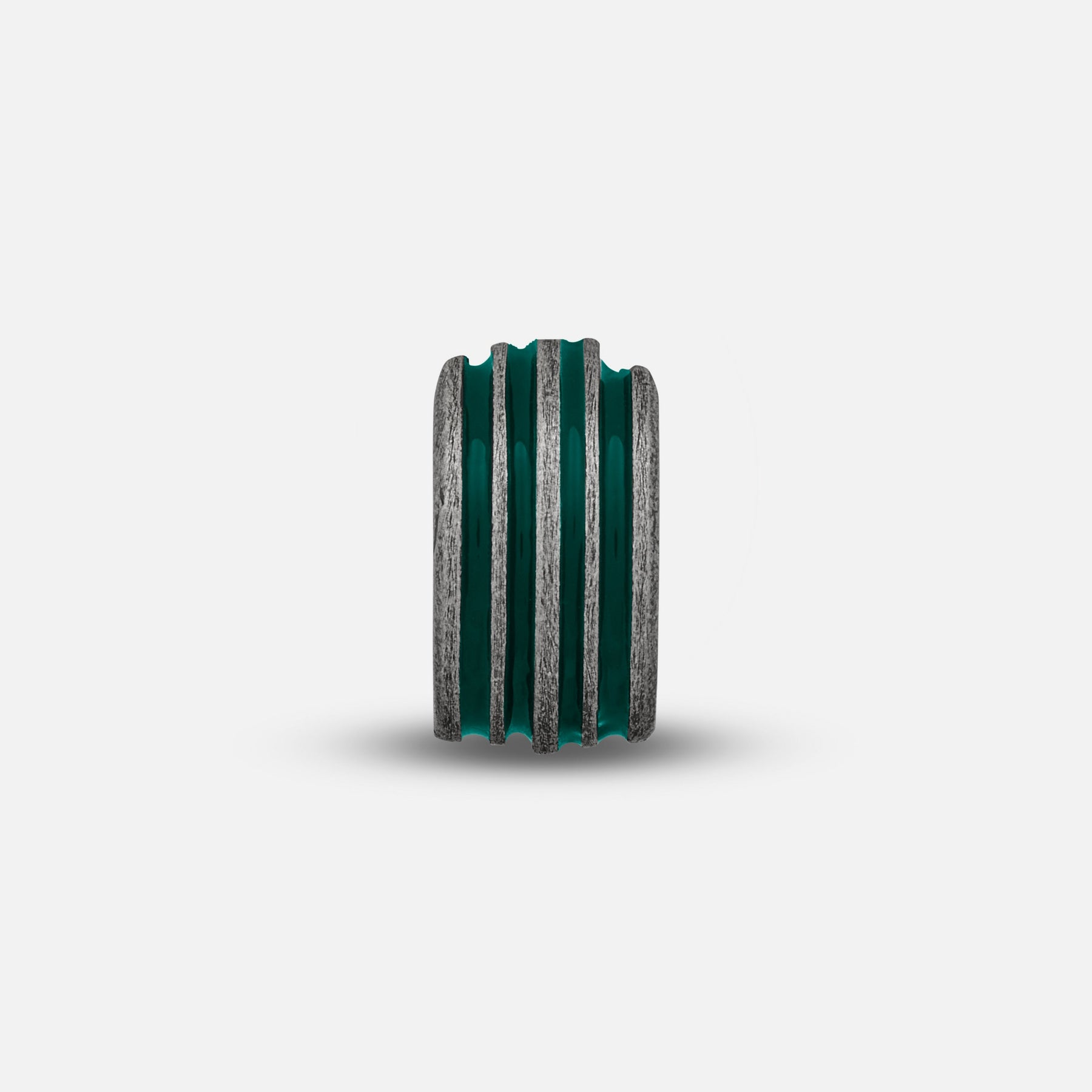 Acies Ear Cuff in Oxidized Silver and Green Enamel: a refined balance of tone and texture. The oxidized silver body is traced with deep green enamel, creating a contemporary accent that evokes vitality, depth, and artisanal precision.