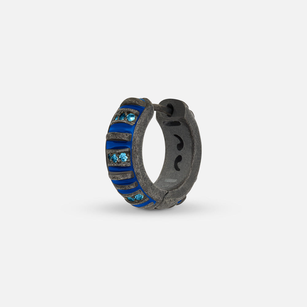 Acies Echo Earring in Oxidized Silver with Green Enamel and Tsavorite: a contemporary fusion of depth and vitality. The oxidized silver hoop is lined with rich green enamel and pavé-set tsavorites, creating a sleek balance between natural brilliance and modern craftsmanship.