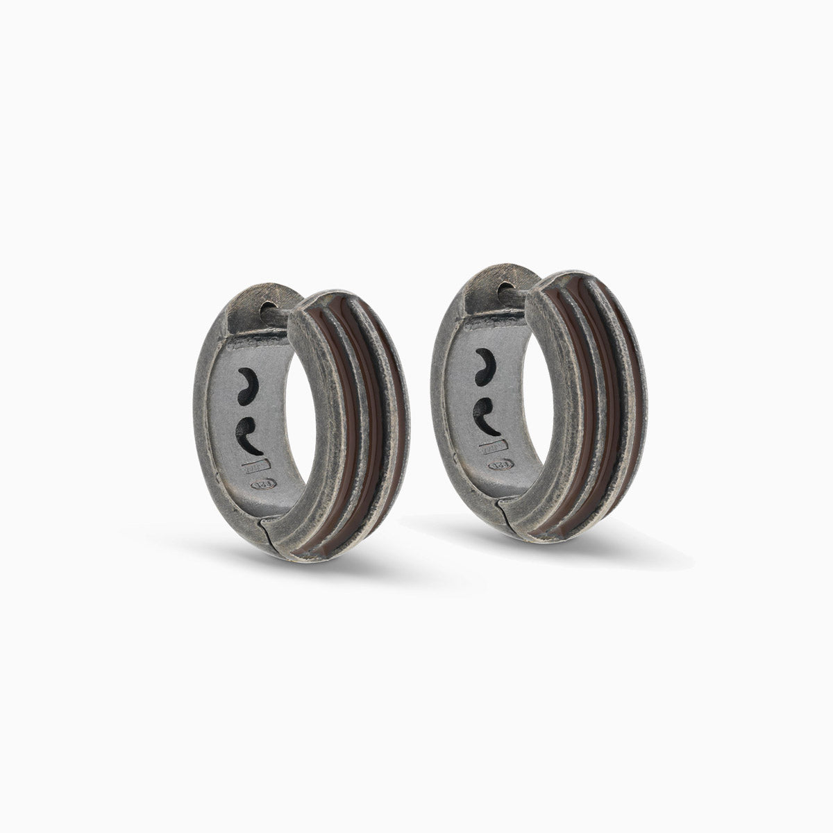 Acies Huggie in Oxidized Silver and Brown Enamel: a subtle fusion of tone and craftsmanship. The oxidized silver surface is lined with smooth brown enamel, creating a refined accent that balances earthy warmth with contemporary precision.