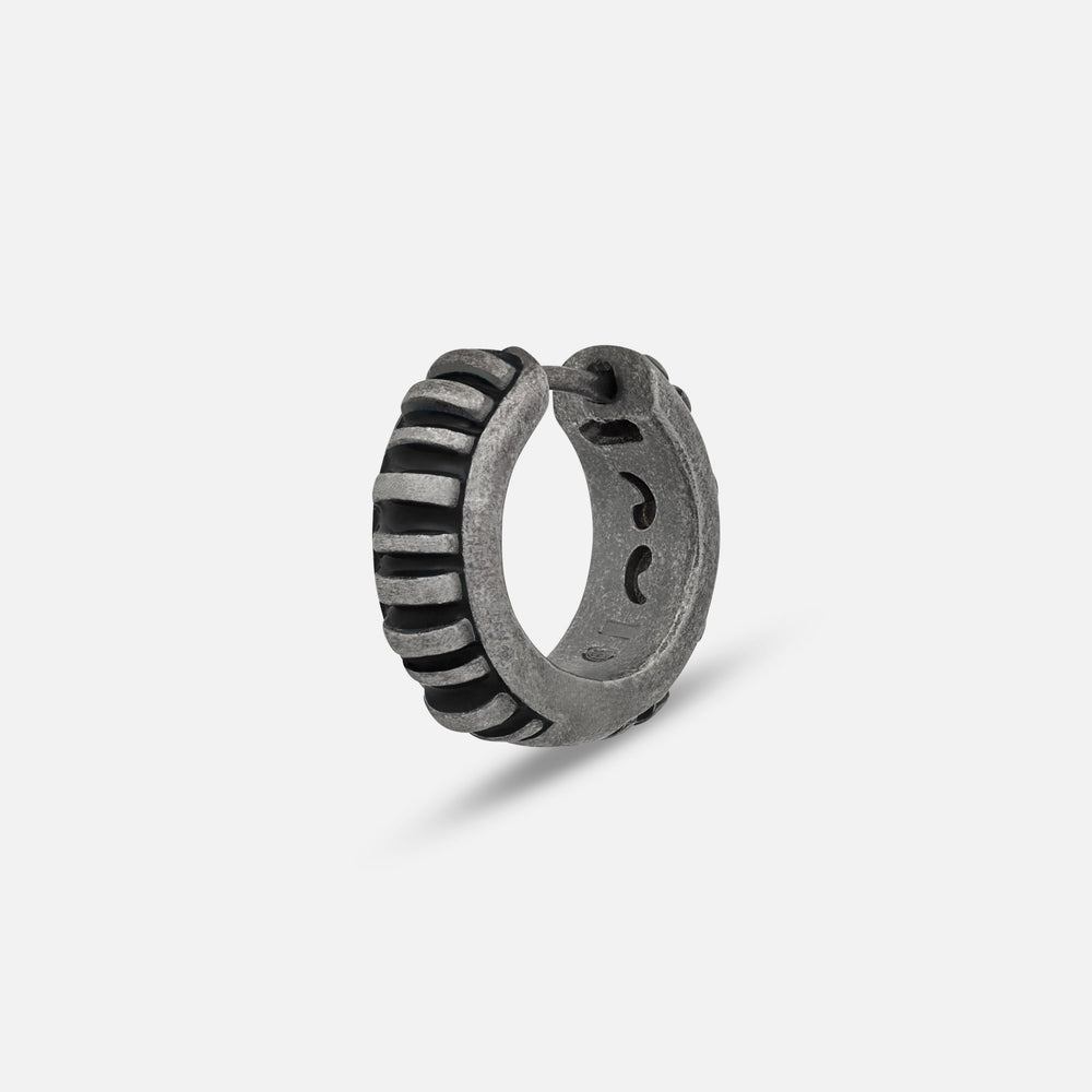 Acies Mini Hoop Earring in Oxidized Silver and Green Enamel: a subtle dialogue between texture and tone. The oxidized silver hoop is traced with smooth green enamel, creating a refined, compact design that channels balance, vitality, and quiet sophistication.