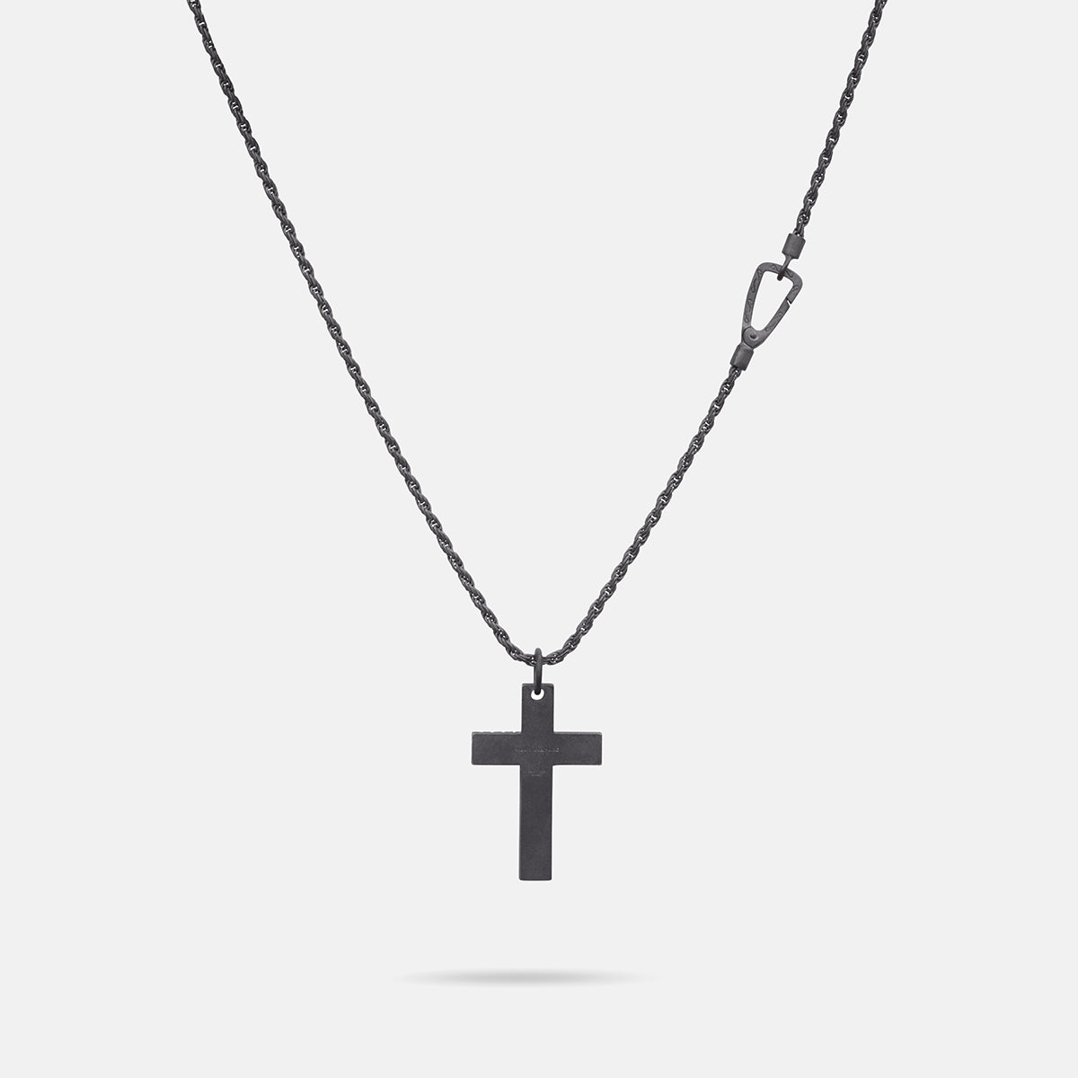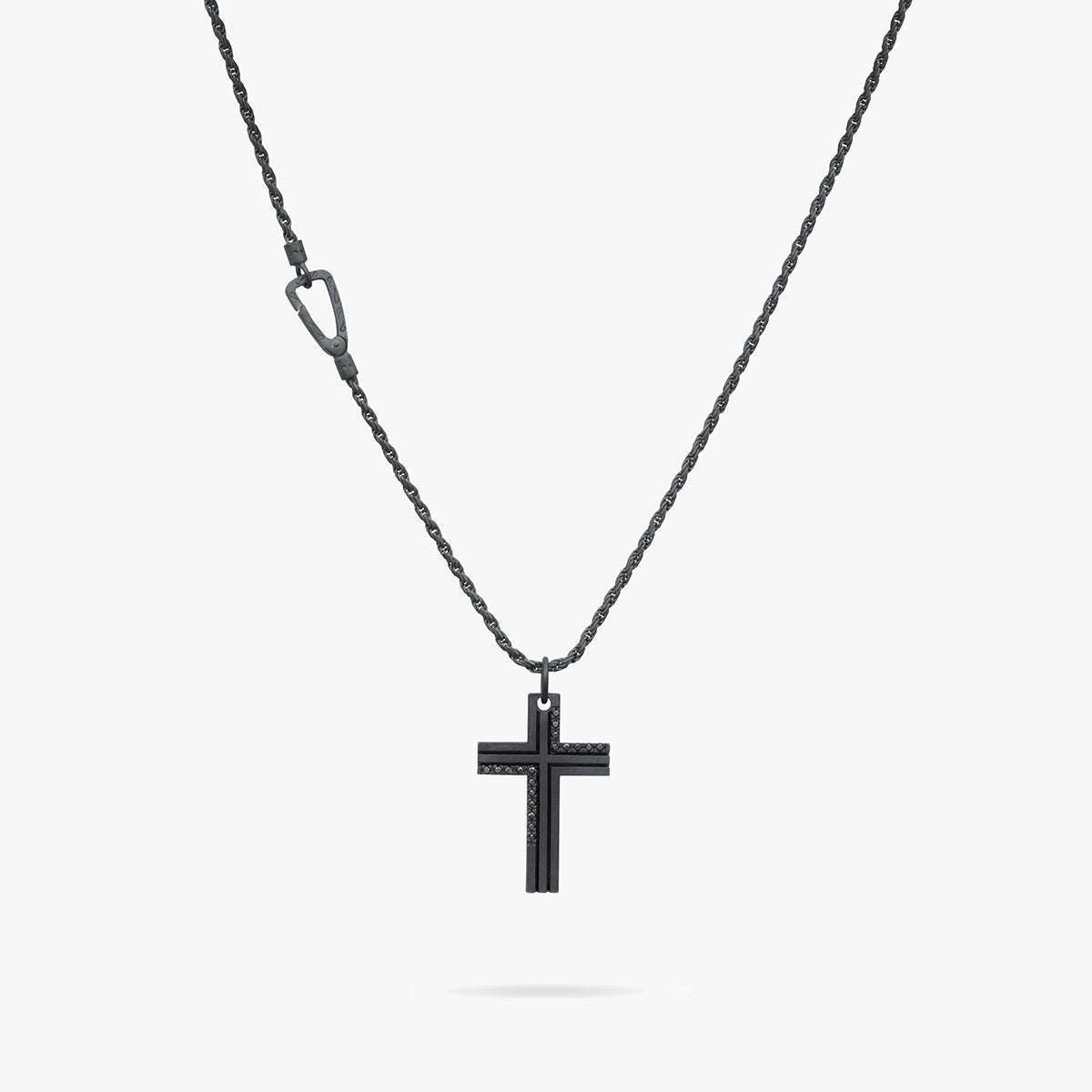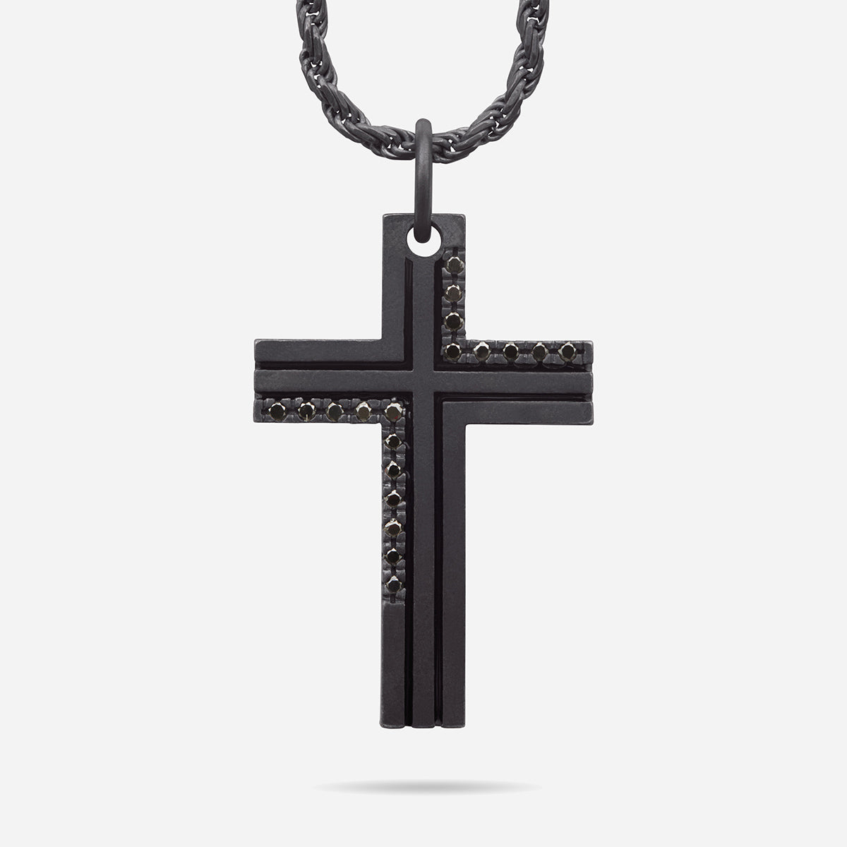 Crafted in oxidized silver, this Double Enamel Cross Pendant features black diamonds and black enamel stripes, adding a touch of luxury.