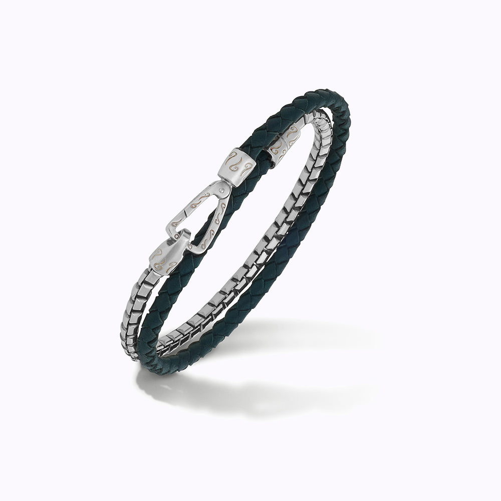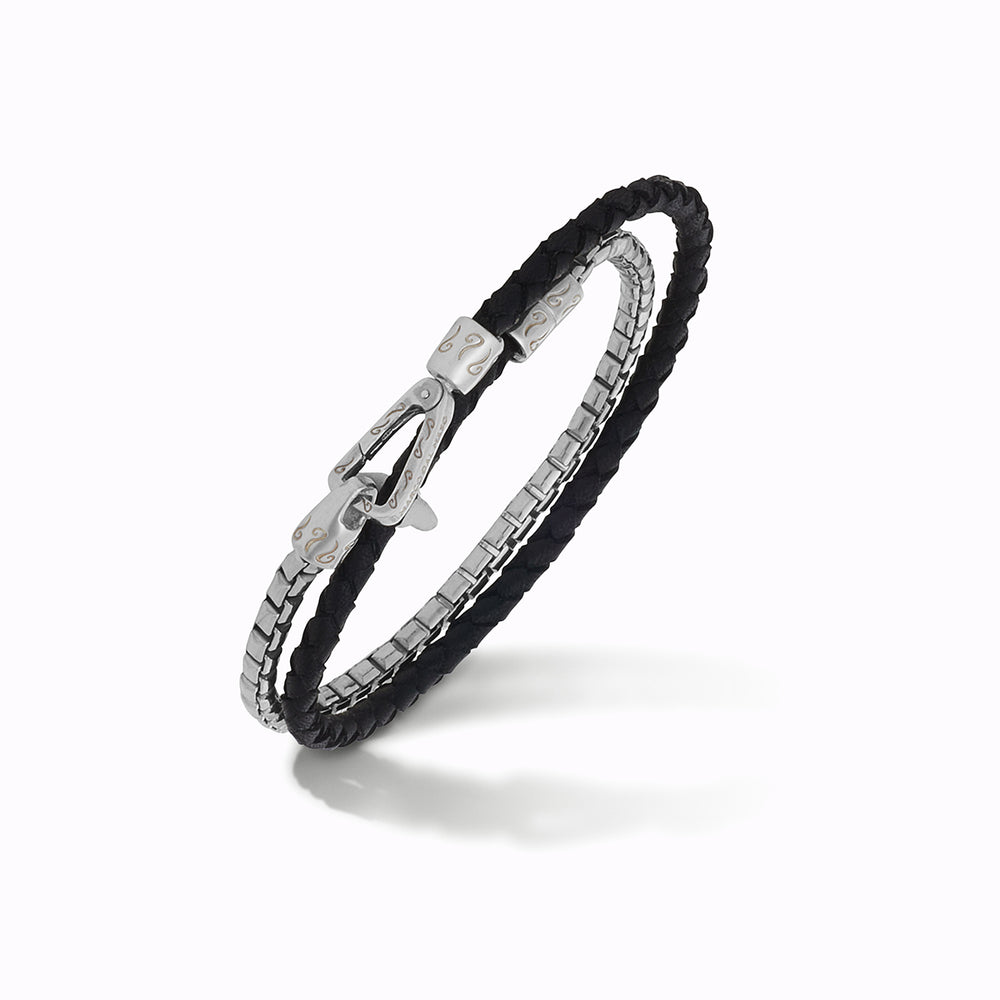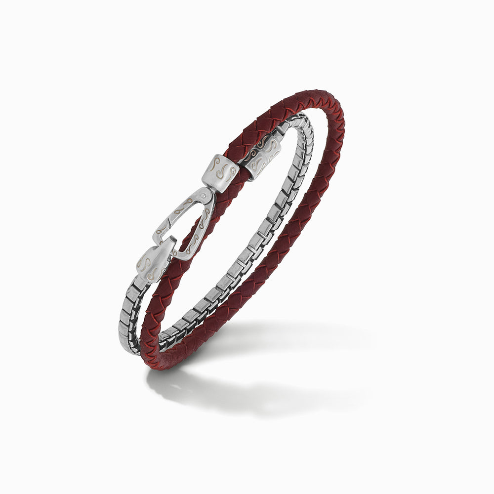 This Lash bracelet features red braided leather paired with polished silver in a double wrap design, creating a bold and contemporary accessory for men. Ideal for those who seek distinctive, luxury jewelry pieces.
