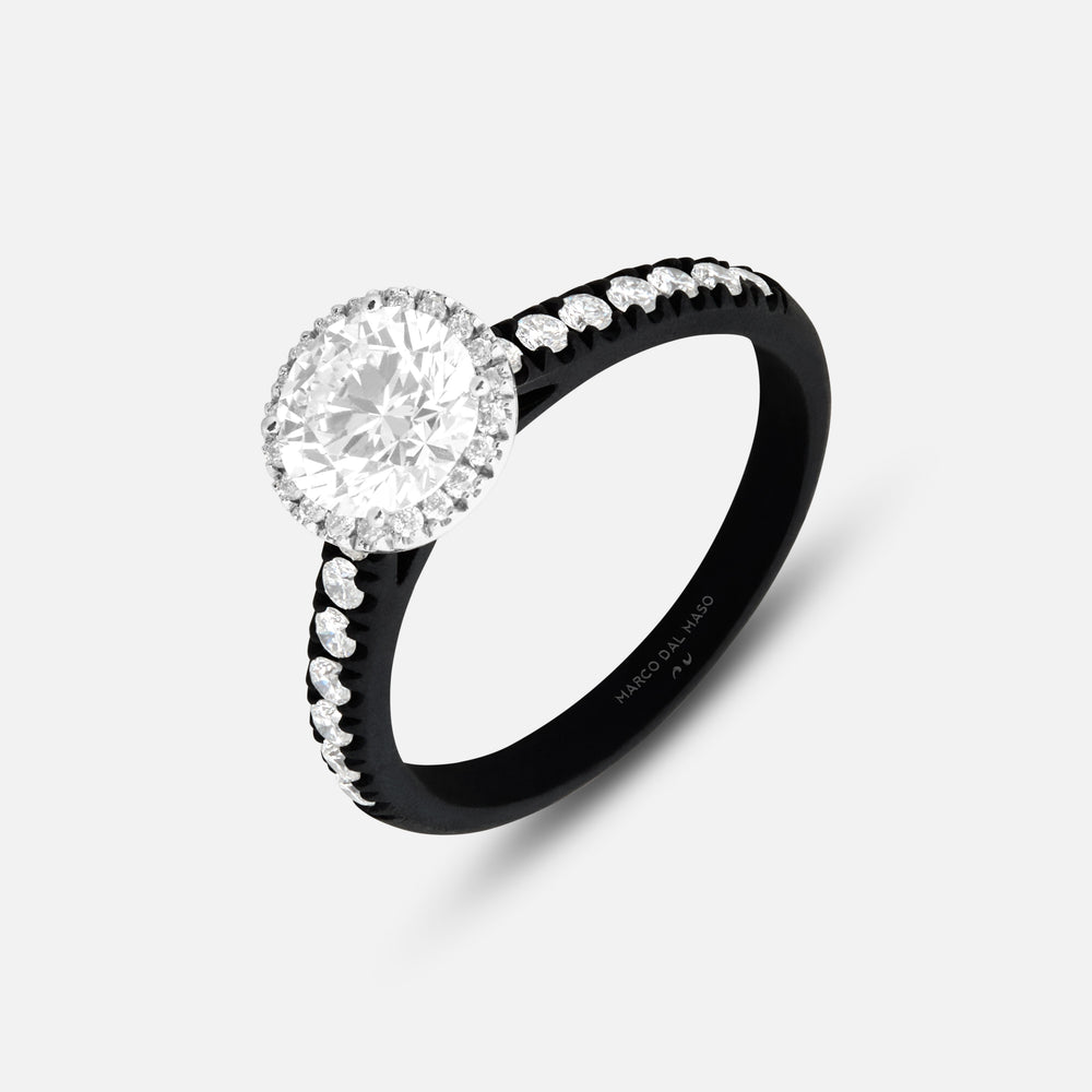 The Eclipse Luna Halo Ring captures light in its purest form. A 1.04ct white lab grown diamond sits at the centre, surrounded by a radiant halo of 0.30ct white diamonds. Set in platinum and anchored by a black titanium band, the silhouette evokes a moonlit glow in motion—refined, powerful, eternal.