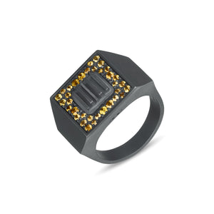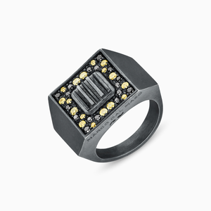 The Gladiator Ring with Sapphires: a luxurious piece crafted from oxidized recycled silver and adorned with yellow sapphires. Perfect for making a statement.
