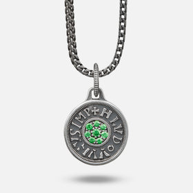 The Moneta Core Pavé Pendant is crafted in Italy from polished and oxidized silver, handset with natural tsavorites. The green gemstones introduce a bold presence, subtle but distinct. Its sophisticated form is designed for daily wear, adding depth without excess.