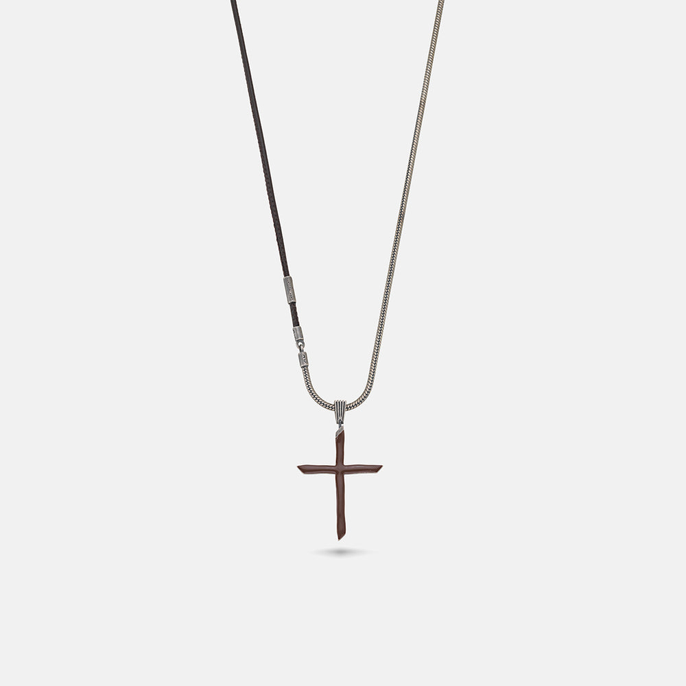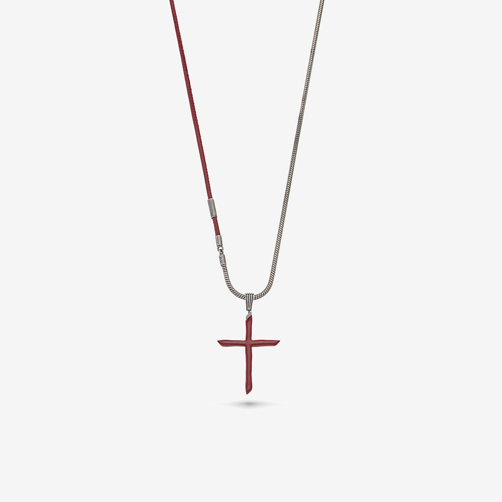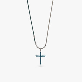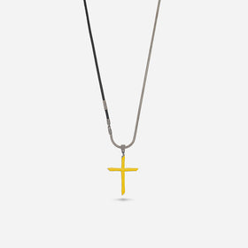 This The Cross Enamel Chain Pendant is crafted with a combination of oxidized silver, yellow enamel, and leather, providing a distinctive, contemporary style.