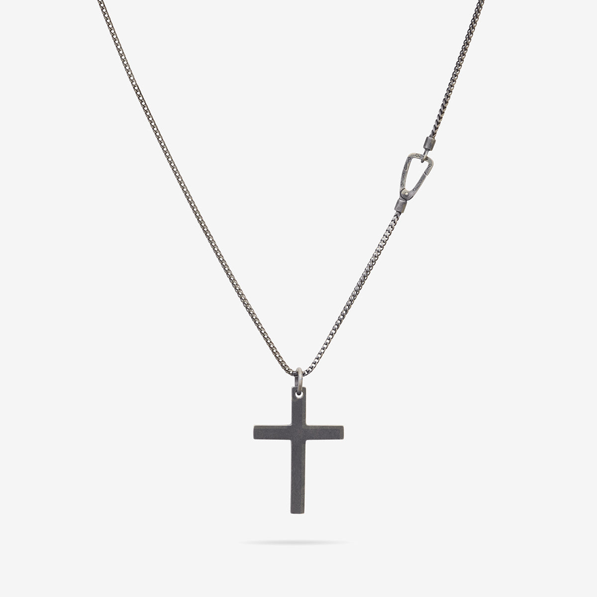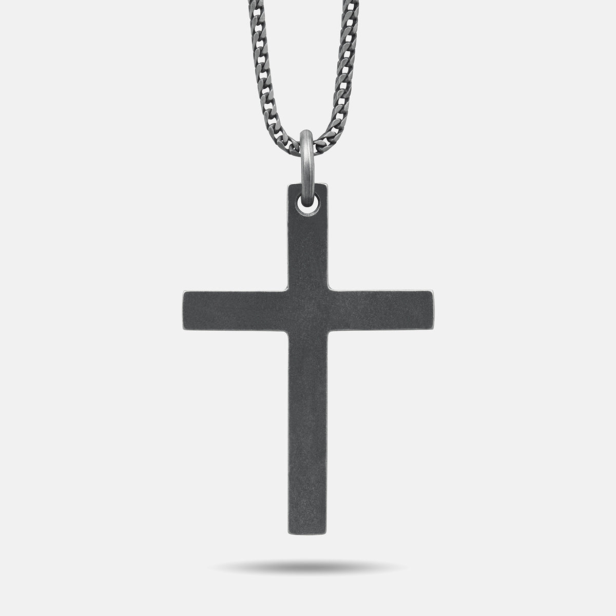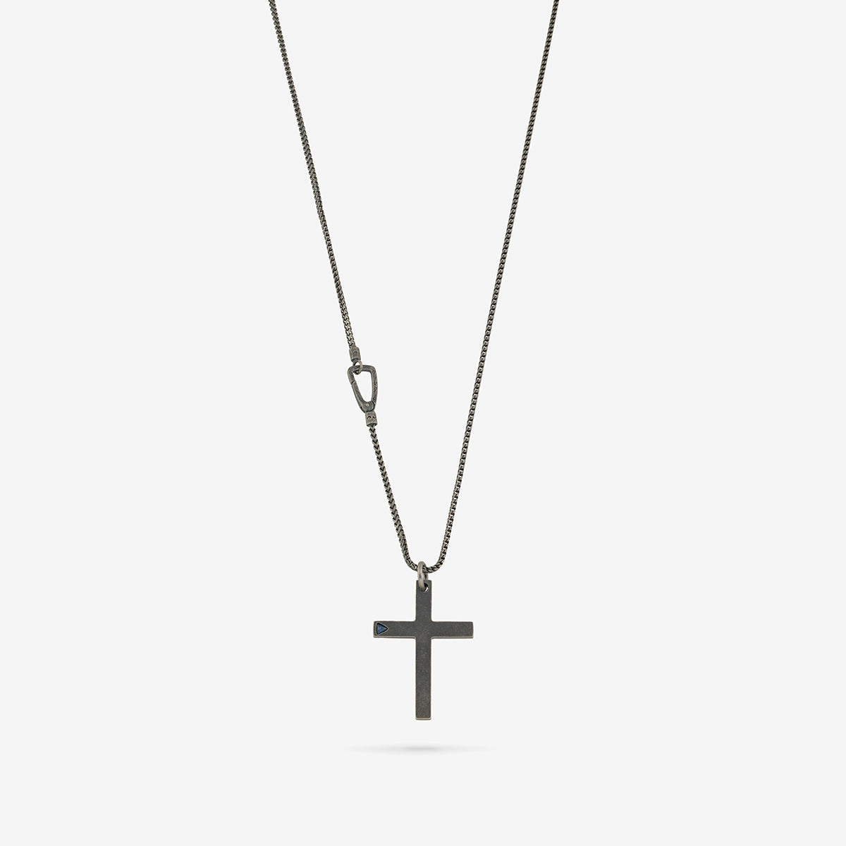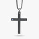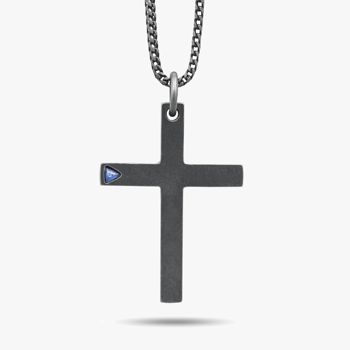 This The Cross Latin Pendant, crafted in oxidized silver and featuring a single sapphire, combines classic design with a touch of luxury.