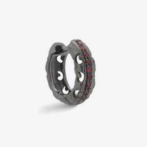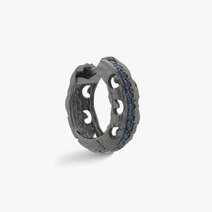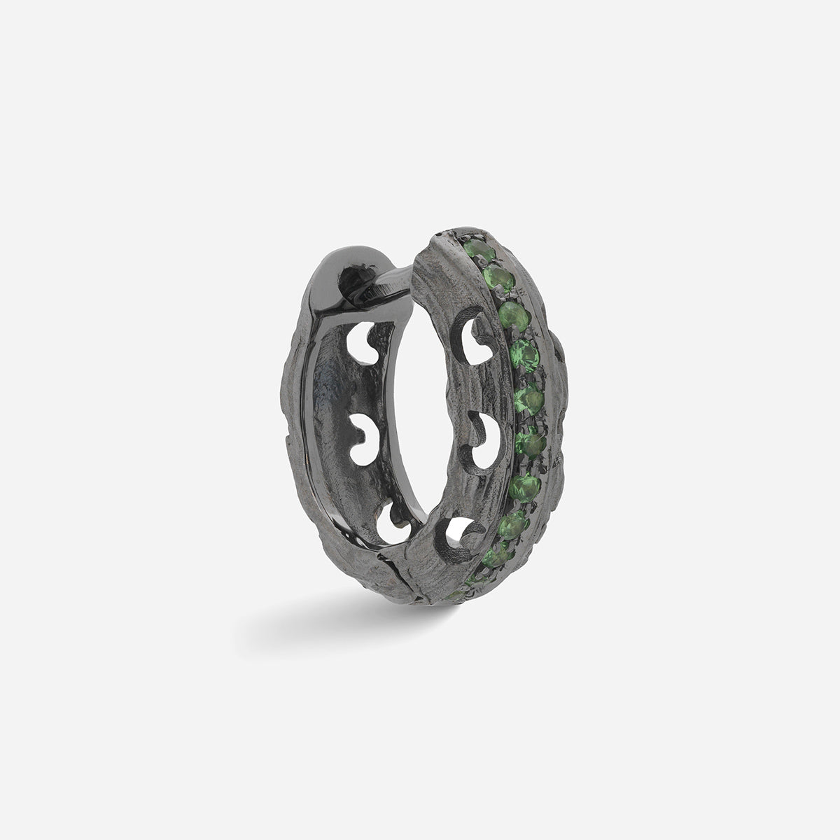 This Warrior Carved Hoop Earring earring in 18K black gold showcases 0.15ct green tsavorites, offering a luxurious yet bold design perfect for any occasion.