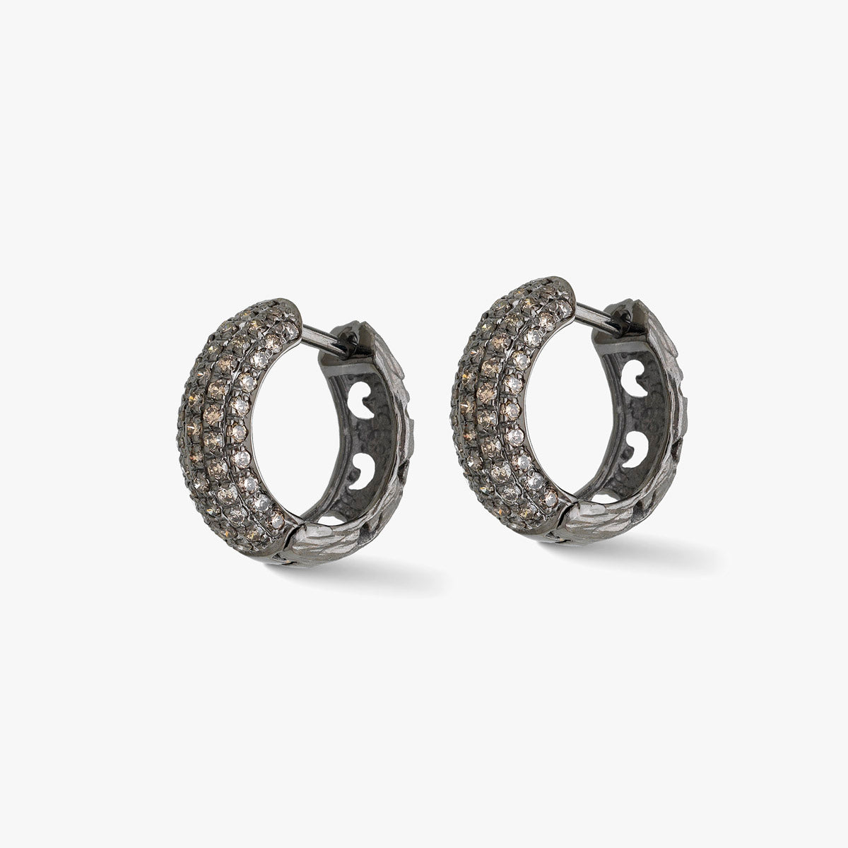 This Warrior Pavé Hoop Earring in 18K black gold with 0.46ct champagne diamonds creates a stunning contrast for a sophisticated yet bold style.