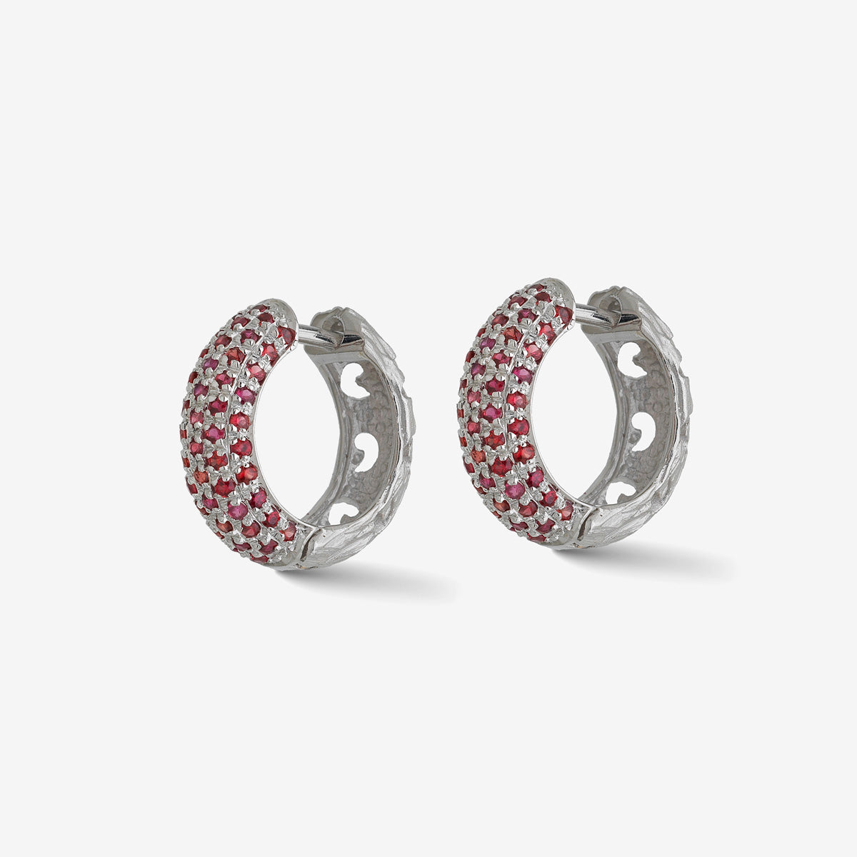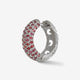 The Warrior 18K White Gold Pavé Hoop Earring is set with 0.46ct red sapphires, creating a sophisticated, striking piece.